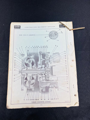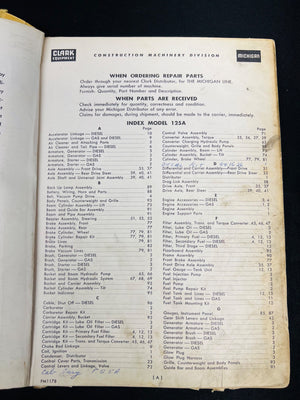 Clark Equipment Company Michigan Parts Manual, Model 125A Tractor Shovel, publication No. 1410. Includes diagrams, part lists, and instructions for repair and maintenance. Published by Clark Equipment Company, Construction Machinery Division. Manual shows signs of use and wear with some handwriting.