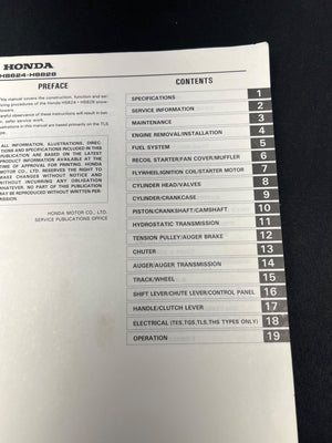 Honda HS624 and HS828 Shop Manual, printed in 1980 by Honda Motor Co., Ltd. Includes comprehensive technical information and repair instructions for these models. Features multilingual content such as English, French, German, and Italian. The manual is in used condition, with wear visible on the cover and pages.