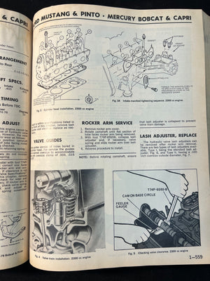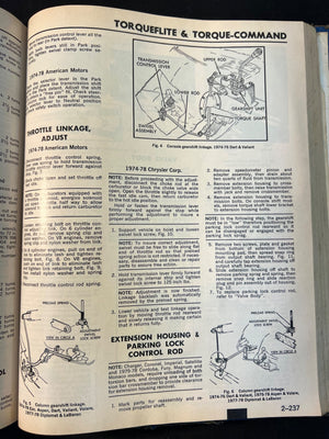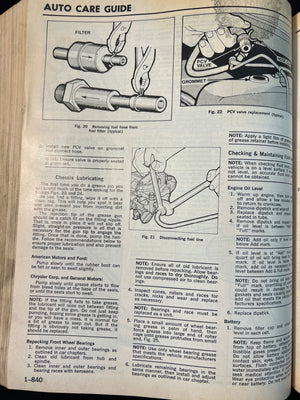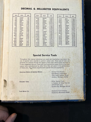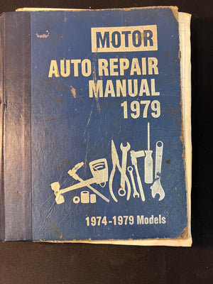 Motor Auto Repair Manual, 42nd Edition, First Printing, published in 1979 by Motor Publishing in New York. Covers 1974-1979 models with technical diagrams and extensive information for automotive maintenance and repair. Includes sections on engine, brakes, steering, electrical, and more. Hardcover with evident wear on the cover and pages; suitable for collectors or automotive enthusiasts.