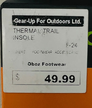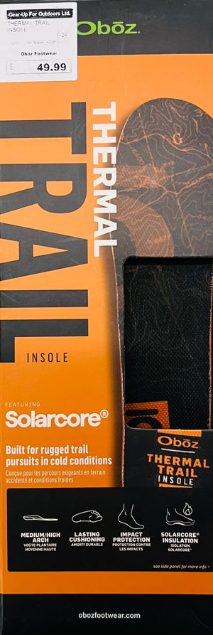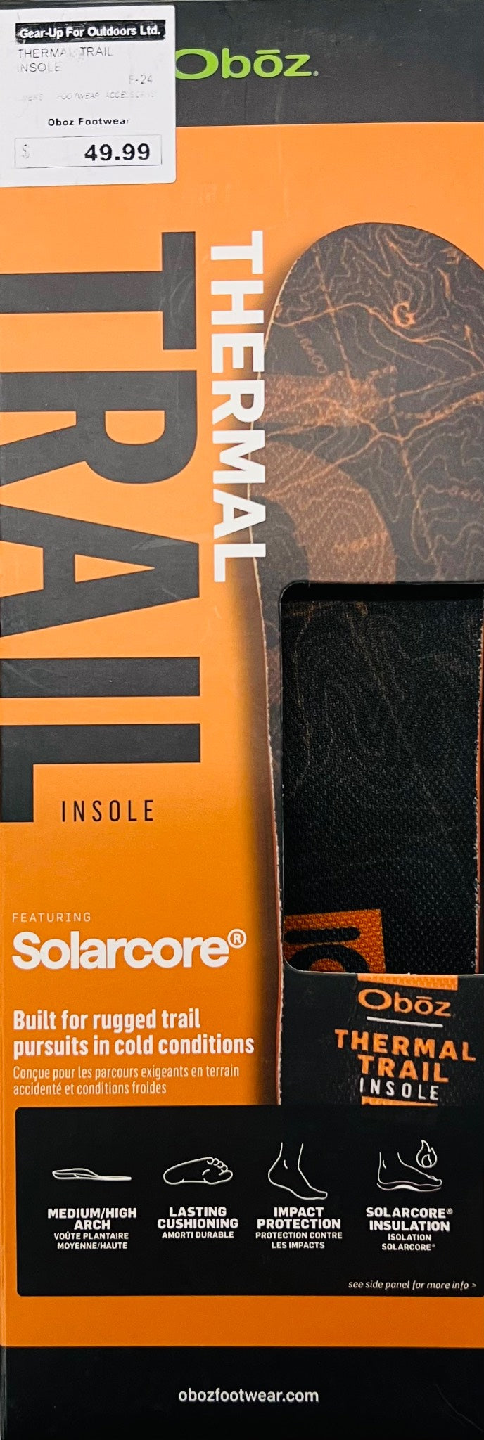 Oboz Thermal Trail Insoles designed for rugged trail pursuits in cold conditions. Features Solarcore insulation for warmth, a comfortable medium/high arch, and an anatomical design for support. Suitable for US men's sizes 11.5-12.5. Packaging indicates original retail price of $49.99. Brand new in box.