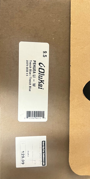 Olukai Pehuea Li shoes in navy blue, size 9.5. Features a breathable mesh upper, lace-up closure, and cushioned footbed for comfort. Includes a versatile drop-in heel for slip-on wear. White rubber sole with a detailed pattern for grip. Comes in original box with retail price label.