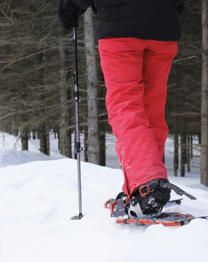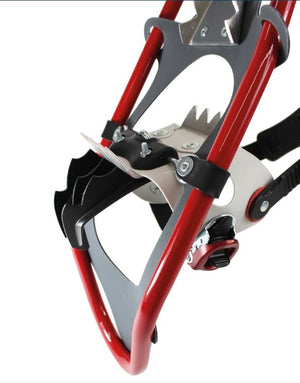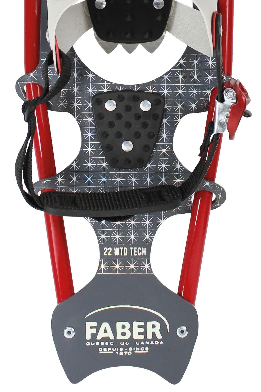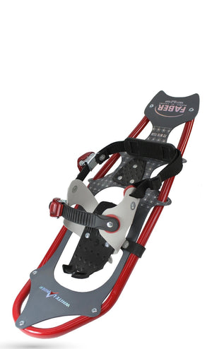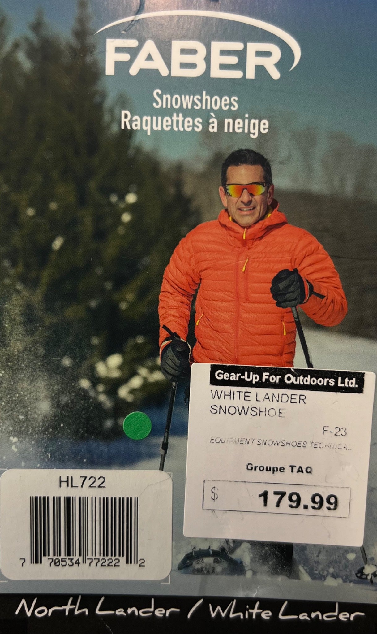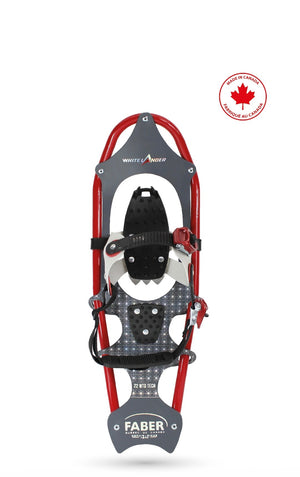 Faber White Lander snowshoes featuring durable aluminum framing and a lightweight build for ease of use on snowy terrains. Equipped with 22 WTD Tech for stability, secure bindings, and crampons for traction. Made in Canada. Suitable for trekking through various types of snow. Package indicates retail price of $179.99.