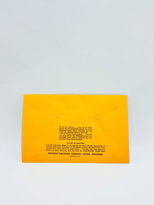 Pack of Japanese postage stamps labeled as 'all different' and 'all genuine.' The packaging notes a price of 39 cents and includes colorful stamps depicting various designs. Manufactured in Japan with information printed on the packaging indicating the Whitman Publishing Company, Racine, Wisconsin.