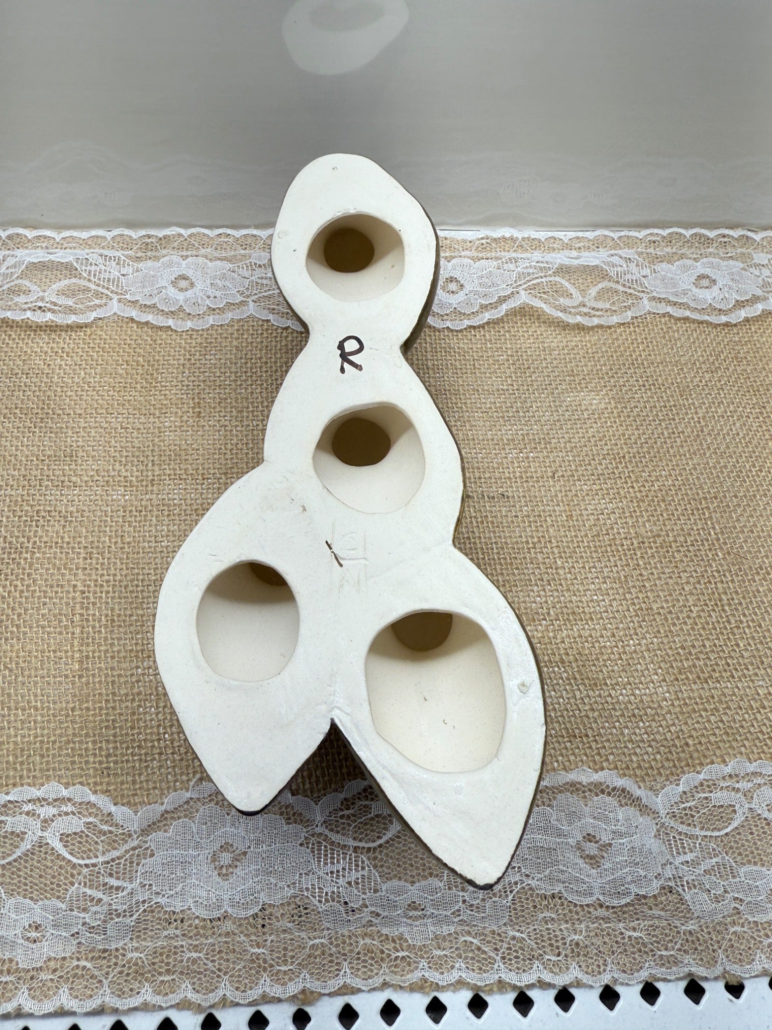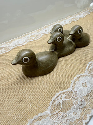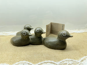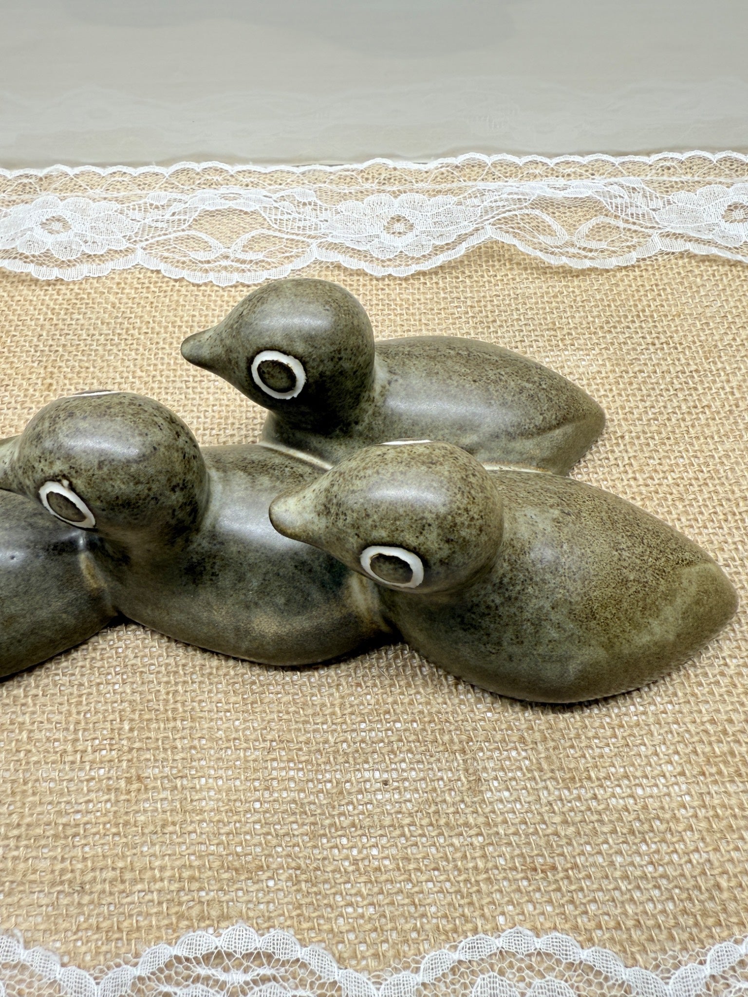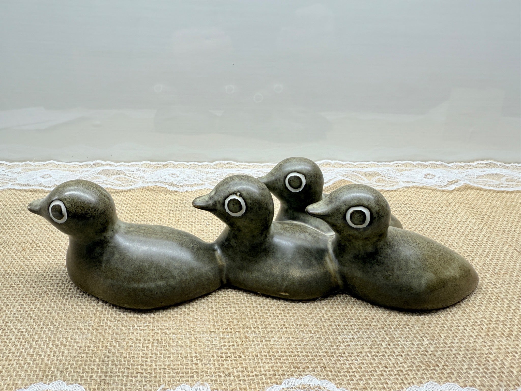Strawberry Hill pottery featuring a quartet of ducklings, crafted in sections with the trailing ducks attached post-molding. Measuring 4 inches wide, 2 5/8 inches high, and 10 and 8 inches long, the design reflects a slightly square form due to historical breakage. Produced until 1994, this item illustrates a unique artisanal technique susceptible to cracking at weld joints. Includes original documentation.