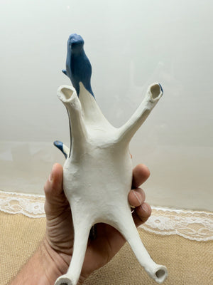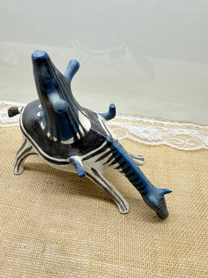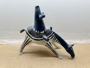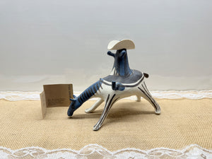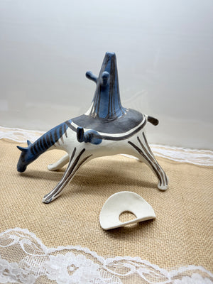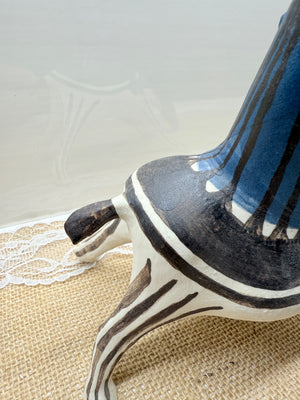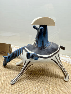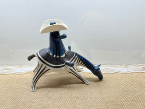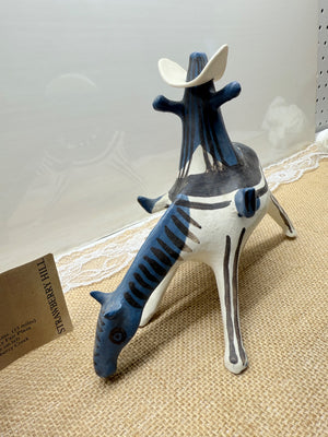 Strawberry Hill horse and Rider sculpture, crafted circa 1969. Approximately 8 inches long, 7 inches tall, and 4 inches wide. Features a removable hat and painted details in blue, black, and white. Only 12 pieces are thought to have been made. Comes with provenance documented through Thunder Bay Estate Sales. No Shipping available.
