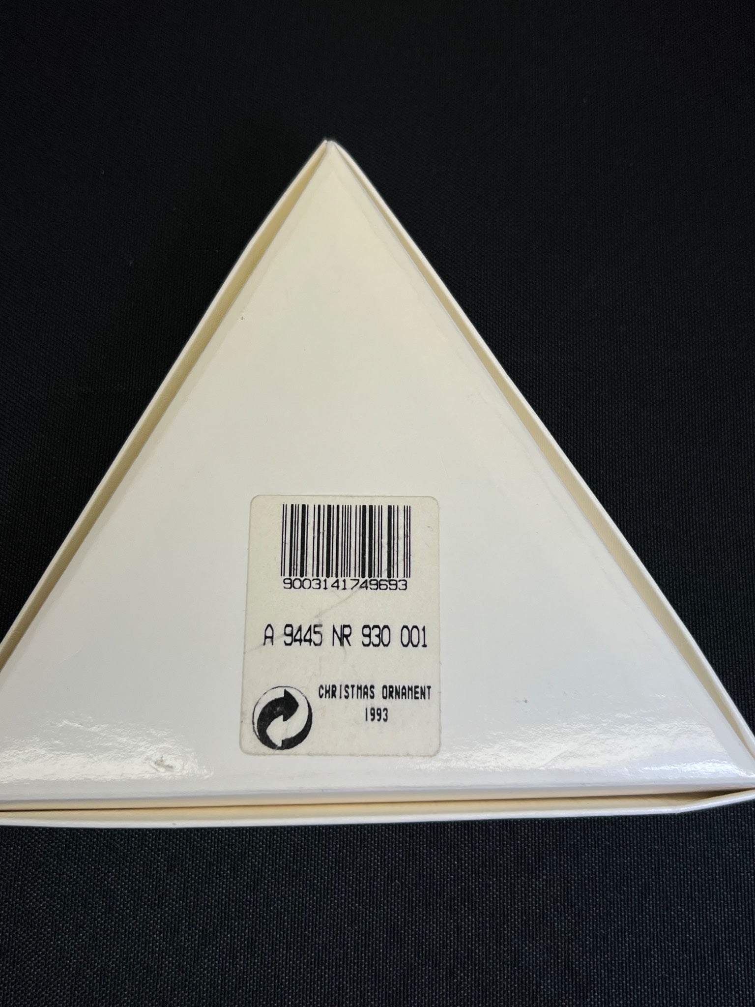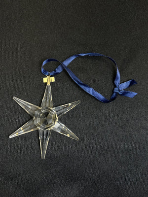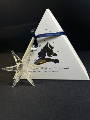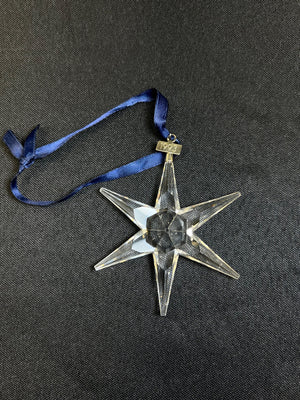 Swarovski crystal star ornament from 1993 made in Austria. Features a clear crystal star design with faceted detailing and a blue ribbon for hanging. Includes original packaging with triangular box and label. Made of high-quality Austrian crystal.