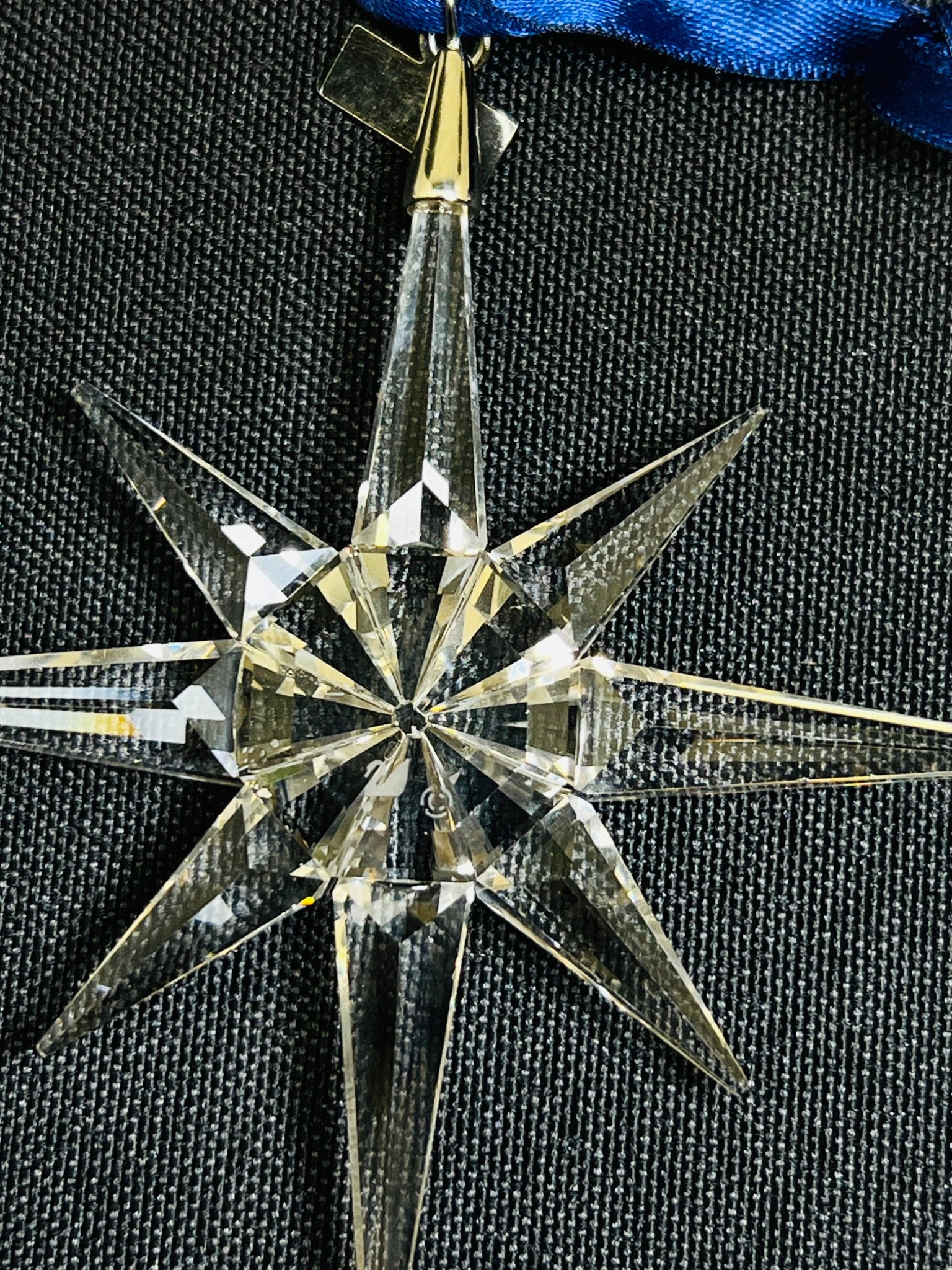 1995 Swarovski crystal star ornament featuring clear Austrian crystal from Austria. Includes original blue ribbon and triangular box with matching year tag. A stunning 8-point star design ideal for collectors or holiday decor.