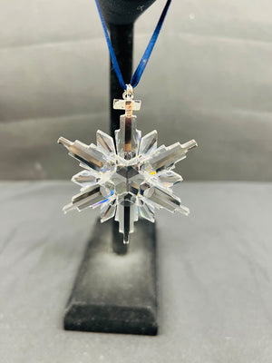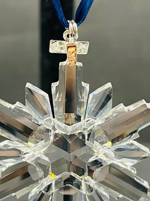 Swarovski 2006 Annual Edition snowflake ornament with a blue ribbon for hanging. Crafted in clear crystal and includes the original triangular Swarovski box and certificate. Ornament is in excellent condition with no visible damage, making it a collectible item for holiday decor enthusiasts.