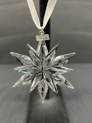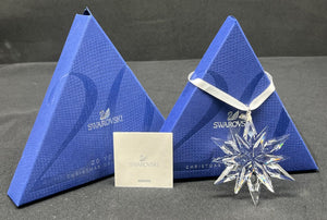 Swarovski 2011 Annual Edition Christmas snowflake ornament crafted in faceted clear crystal. Features the year ‘2011’ on a silvertone metal tag and includes the original ribbon for hanging. Comes with the original triangular blue Swarovski box and certificate. Made in Austria.