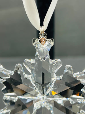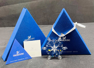 Swarovski 2012 annual edition snowflake ornament featuring faceted clear crystal. Includes original blue triangular box, ribbon for hanging, and accompanying inserts. Made in Austria. Ornament measures approximately 3 inches in diameter. In excellent condition with no visible damage or defects.