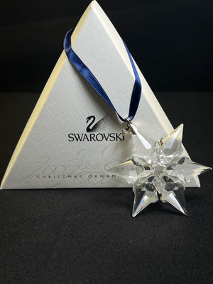 Swarovski crystal ornament from 2000, crafted in Austria. Features a delicate star-shaped design with a blue ribbon for hanging. Includes original triangular box and certificate. A collectible piece from a renowned crystal manufacturer.