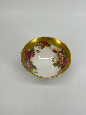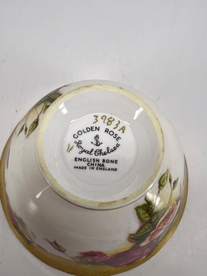 This English Bone China bowl, features a 'Golden Rose' pattern with a gilded trim and floral decor. Manufactured by Royal Chelsea in England, it exemplifies the detailed craftsmanship of mid-century English porcelain. The base is marked ‘Golden Rose, Royal Chelsea, English Bone China, Made in England’ and numbered 3983A.