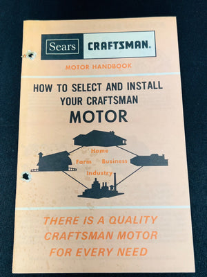 1971 Craftsman Motor Handbook by Sears detailing guidelines for selecting and installing motors for home, farm, business, and industrial needs. Includes diagrams, instructions, and promotion of the Sears motor line. Two-hole punch on the edge, reflective of practical use.