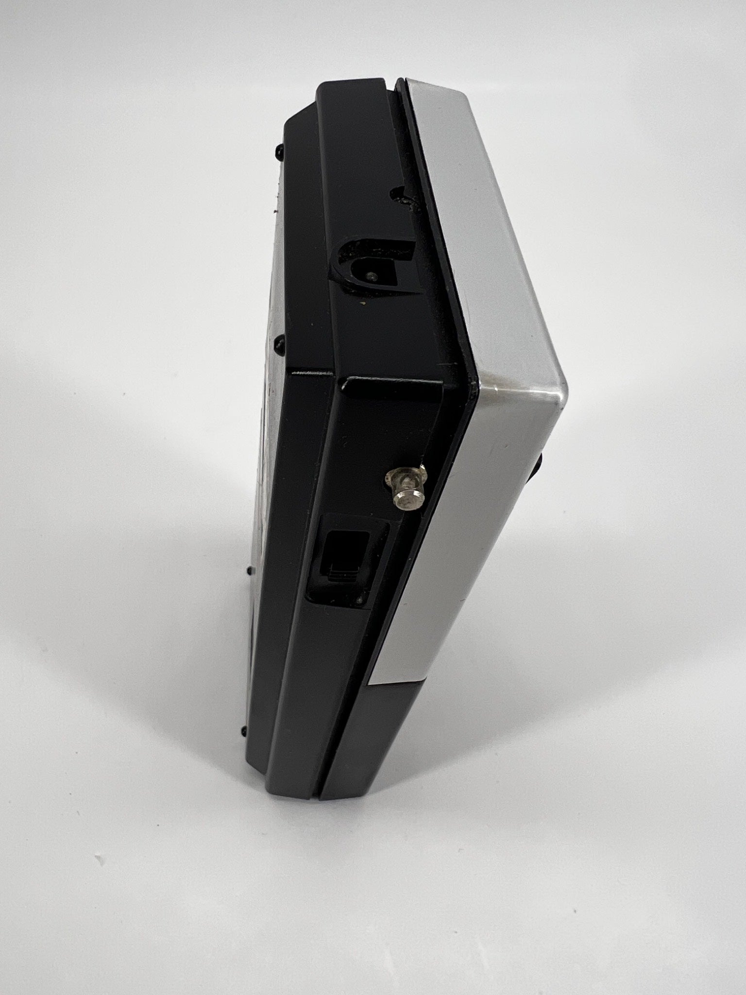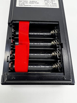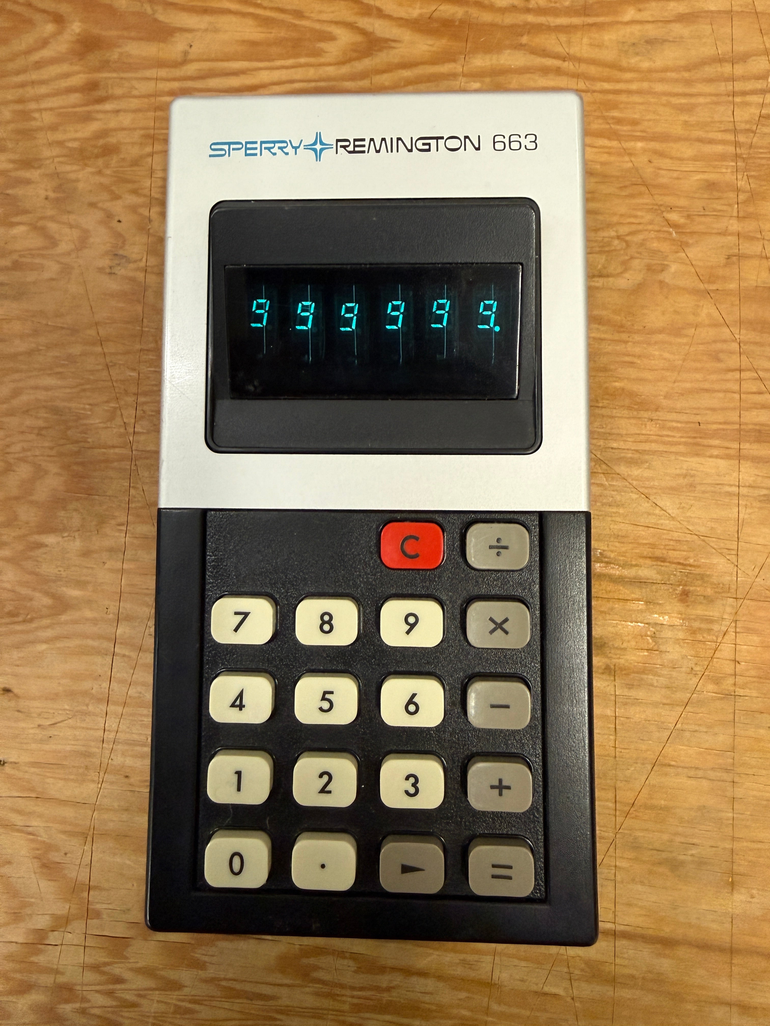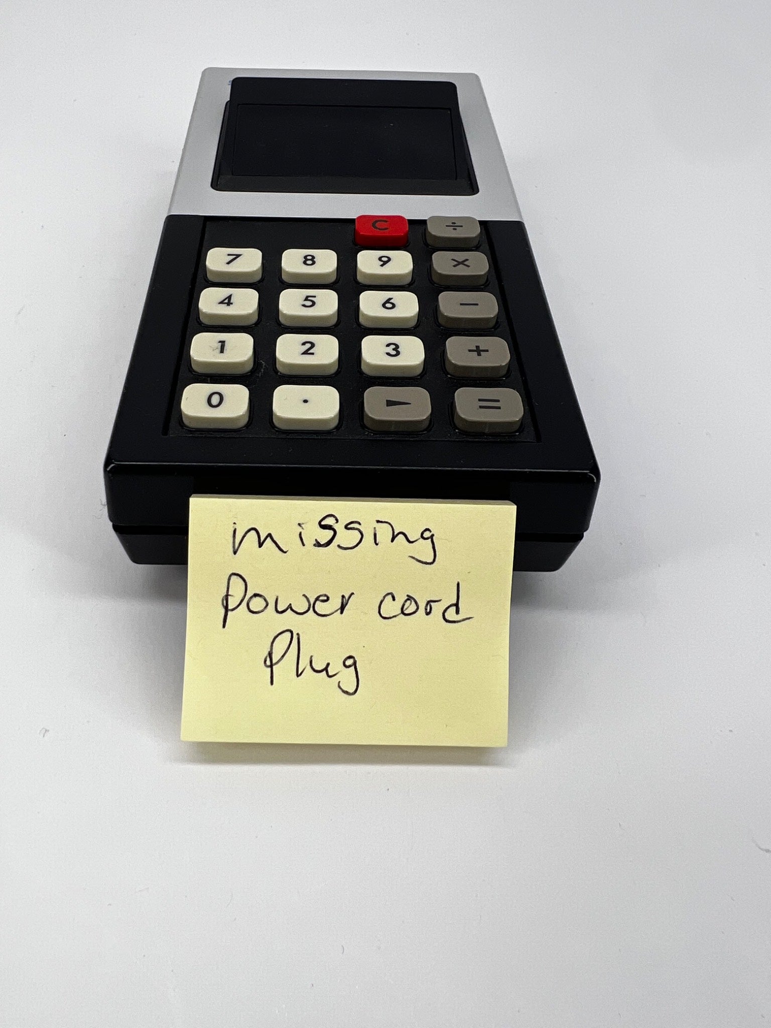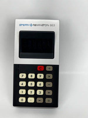 Sperry Remington model 663 calculator, manufactured in Japan in 1975. Features a silver and black plastic body with a numeric keypad and operational buttons. Operates using batteries or an AC adapter; the power cord plug is missing. Battery compartment visible and clean. Measures approximately 8 inches tall by 4 inches wide.