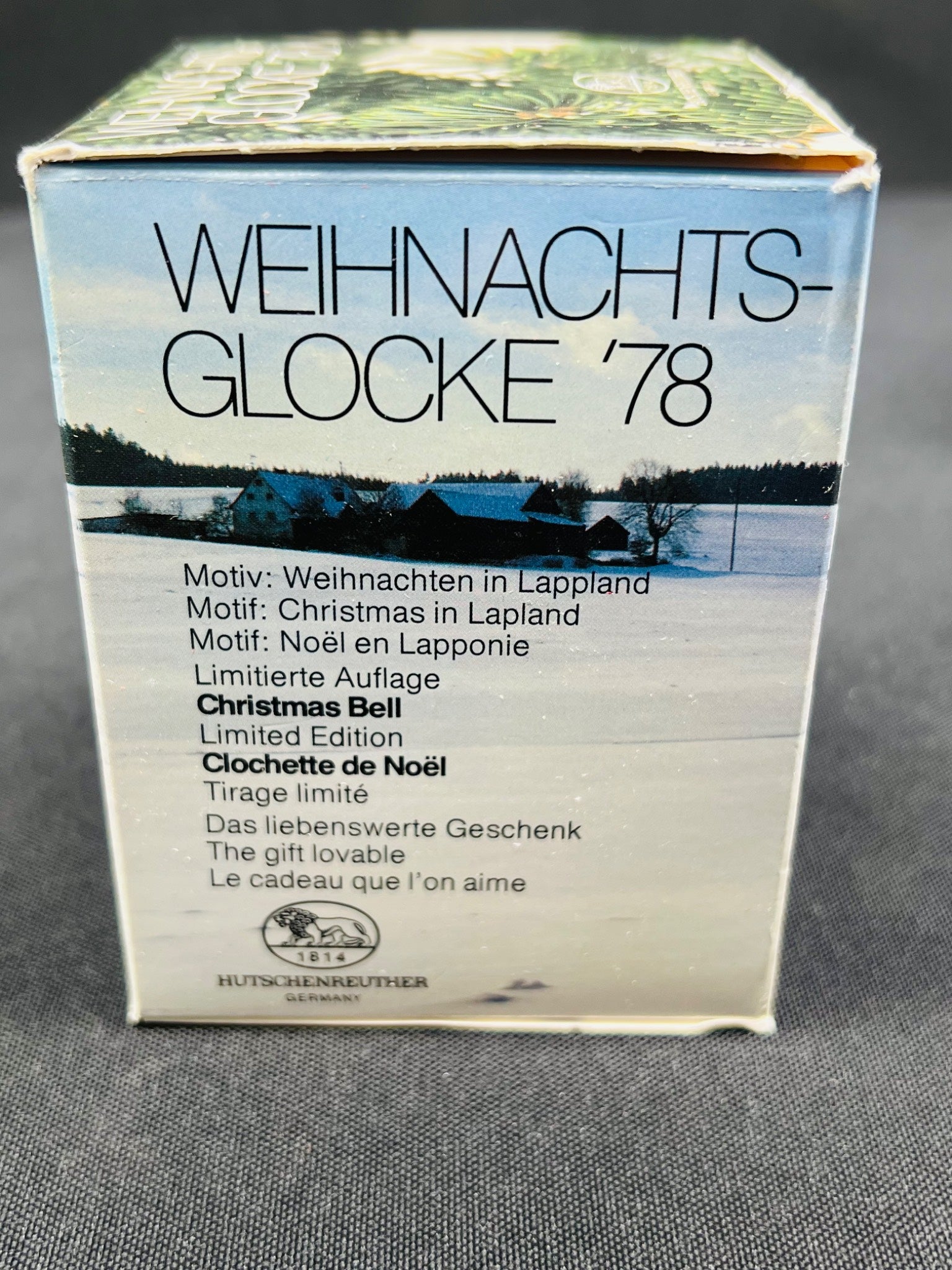 1978 Hutschenreuther Christmas Bell titled ‘Weihnachtsglocke 78,’ featuring ‘Christmas in Lapland’ motif. Crafted from fine porcelain with vibrant illustrations of reindeer and a winter scene, adorned with a red ribbon for hanging. Includes original box. Limited edition collectible in excellent condition.