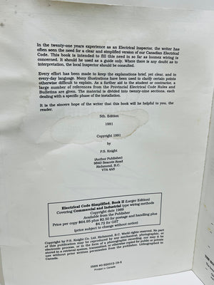 1981 edition of the 'Electrical Code Simplified: Residential Wiring' book, Ontario Book 1. Published by P.S. Knight Limited and based on the 20th Edition of the Ontario Hydro Safety Code. Printed in Canada. The paperback book shows visible signs of age and wear, with some water damage on the back cover and light staining. Ideal for reference or collection.