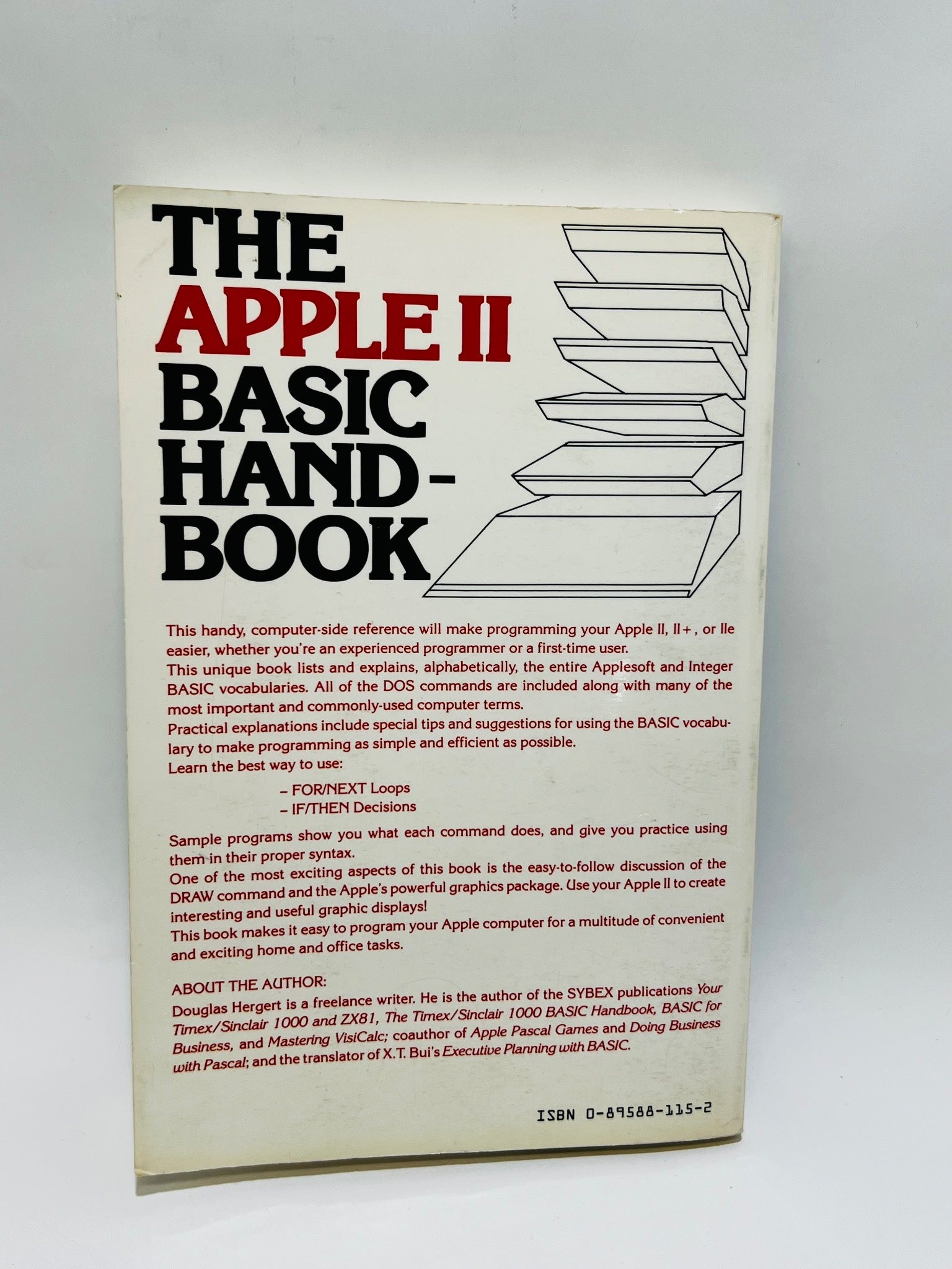 1982 Apple II Basic Handbook written by Douglas Hergert, published by SYBEX. A guide specifically designed for the Apple II, Apple IIe, and Apple II Plus models. Includes comprehensive references, instructions, and examples to assist with programming and usage of these computers. Printed in the USA. Paperback format, 176 pages.