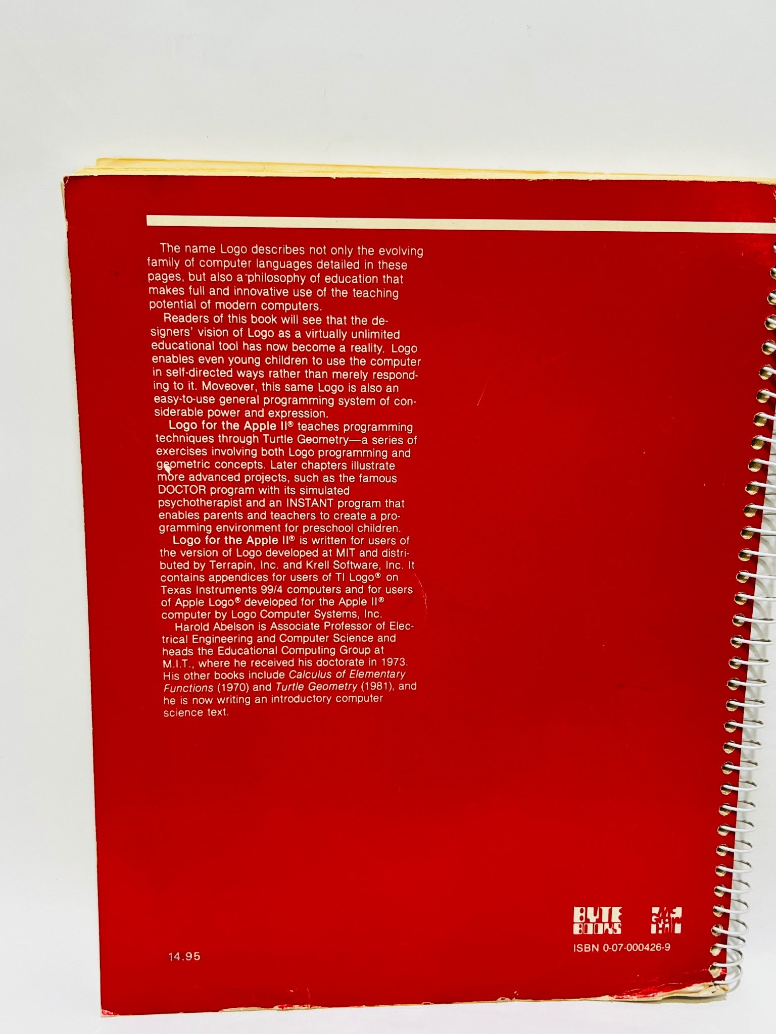 Logo for the Apple II by Harold Abelson, published in 1982. Spiral-bound manual with detailed instructions on using the Logo programming language. Manufactured in the United States and printed by Byte Books. Contains black-and-white text and graphics with 126 pages. ISBN 0-13-539985-5 displayed on the back cover.