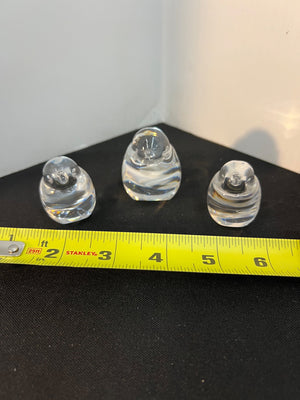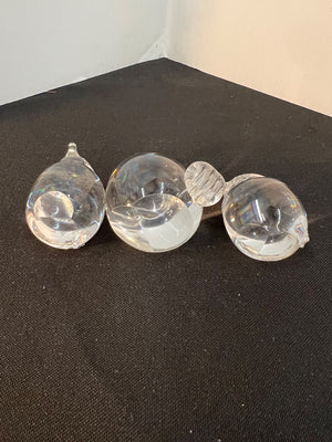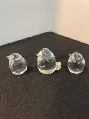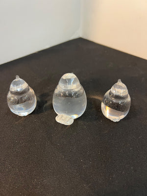 Three clear glass Penguin figurines with smooth, rounded designs. Each bird showcases finely crafted features and variations in size, as shown in images with measurements. The largest bird includes a molded tail design. Items are in excellent condition with no visible chips or cracks.