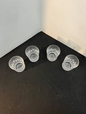 Waterford crystal drinking glasses featuring a cut glass design. Each glass showcases intricate detailing and a sturdy base. The lot appears suitable for serving beverages and adds an elegant aesthetic. All pieces are in good condition with no visible signs of chips or cracks. Set of 4.