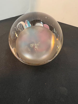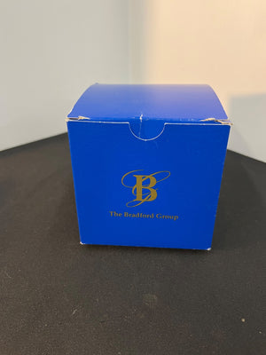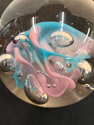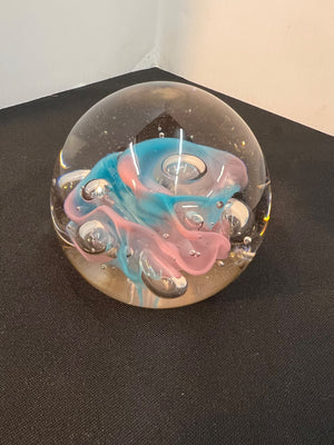 Bradford Group glass paperweight featuring a multicolored pink and blue swirl design with air bubble inclusions. Comes in the original blue box marked with 'The Bradford Group' in gold lettering. The paperweight is in overall good condition with light wear. Box presents minor scuffing.