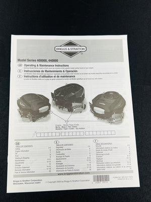 Operating and maintenance instructions for Briggs & Stratton engine models 400000 and 440000. Includes multilingual text and diagrams for setup, use, and maintenance. Essential for proper operation and care of listed engine models. Condition is used but appears readable and complete.