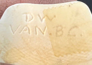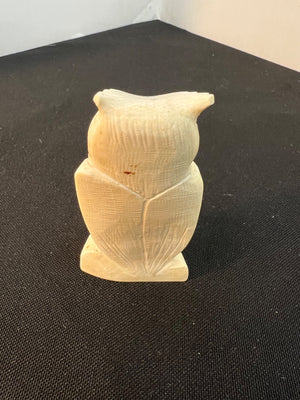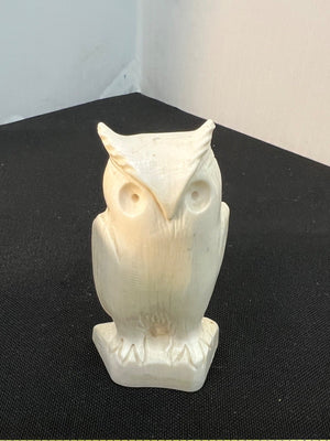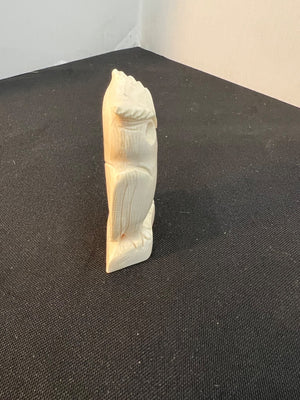 A handcrafted owl figurine carved from a single piece of material. The piece measures approximately 5 inches tall. The base is inscribed with 'DW VAN. BC.' showing regional craftsmanship. The carving displays detailing on the owl's plumage and posture. Overall condition suggests minimal signs of wear.