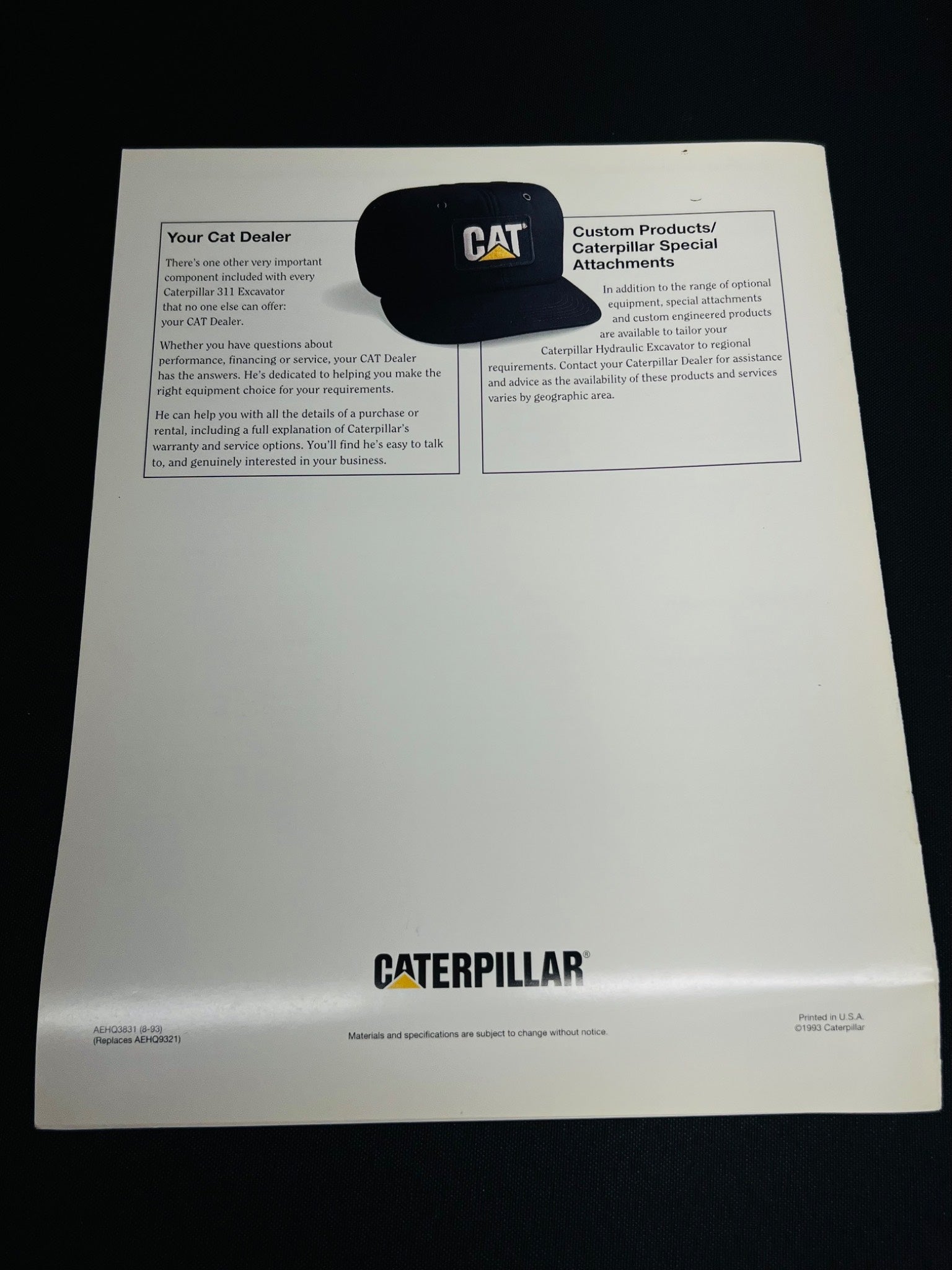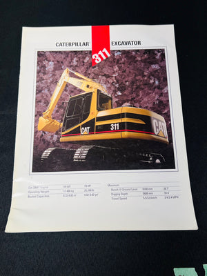 Caterpillar 311 Excavator promotional brochure featuring product specifications, features, and benefits outlined in detail. Includes imagery of the excavator, technical data, and insights into operator comfort, reliability, and versatility. Appears to be targeted toward potential buyers and dealers. Printed in the USA.
