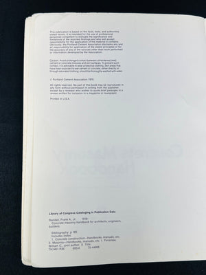 Concrete Masonry Handbook for Architects, Engineers, Builders, authored by Frank A. Randall and Wilbur C. Panarese, published by the Portland Cement Association. Fifth edition, copyright 1971. Blue cover with architectural sketches, 395 pages. Features detailed information on concrete masonry construction methods. Some wear evident on cover edges and corners, interior pages appear clean and intact.