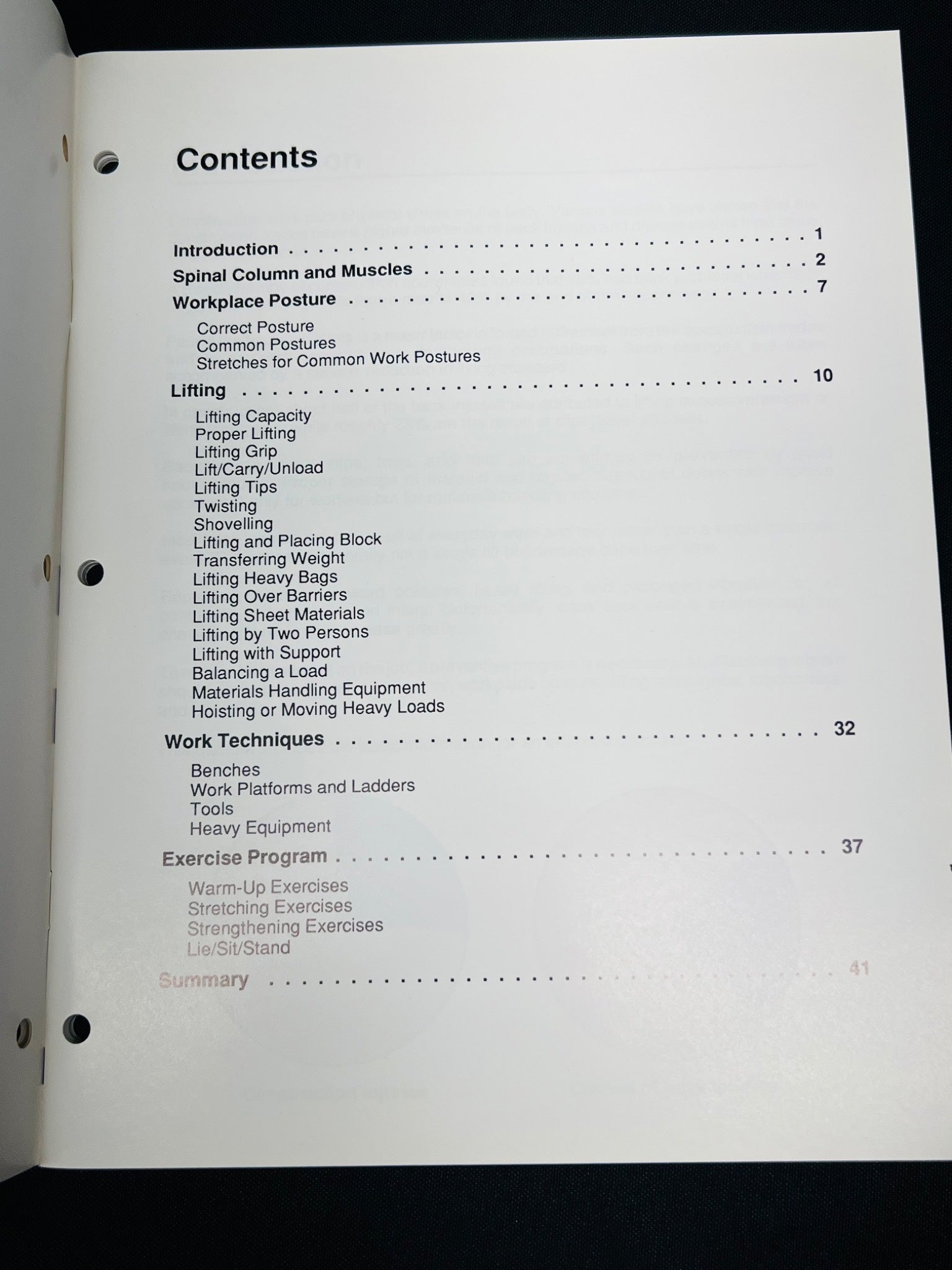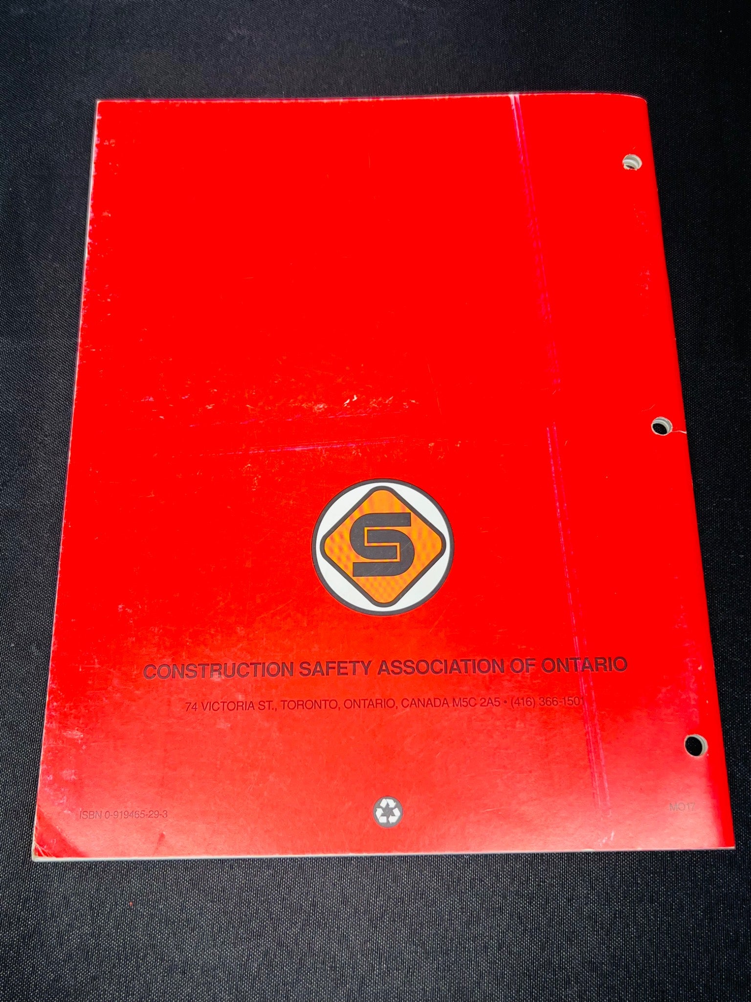Manual titled ‘Stand Lift Carry’ by the Construction Safety Association of Ontario. The booklet provides detailed content on workplace posture, lifting techniques, and exercise programs for handling heavy materials. It is three-hole punched for easy storage and includes 41 pages of comprehensive safety guidance.