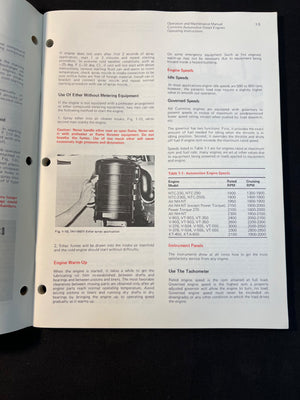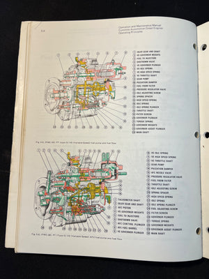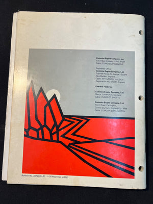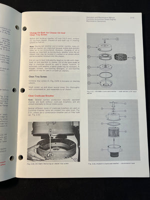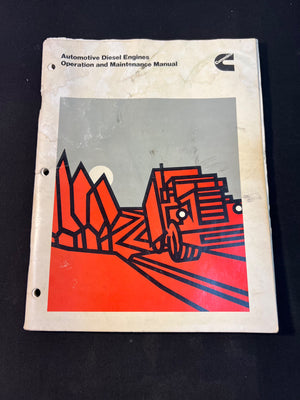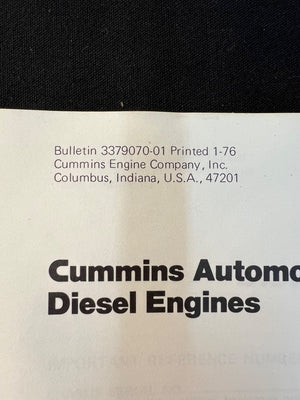 Cummins Automotive Diesel Engines Operation and Maintenance Manual, Bulletin 3379070-01, printed in January 1976. Published by Cummins Engine Company, Columbus, Indiana, USA. Includes diagrams, step-by-step instructions, and detailed parts illustrations for diesel engine maintenance. Three-hole punched with signs of use; minor wear to the cover and binding, but pages are intact and legible.