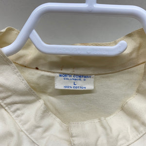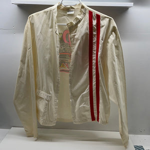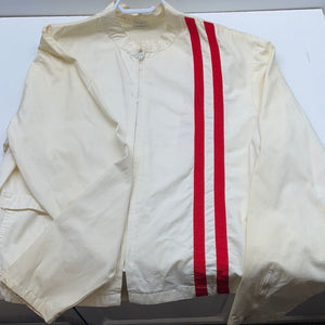This 100% cotton made in USA Ford jacket is a zip up style with zippers on each sleeve and a small pocket on the front right. It is a men’s size large! This jacket does not appear to be worn very much if at all but does have a couple of slight stains on the inside collar and a little on the front jacket near the zipper. I have not tried to clean this jacket at all.