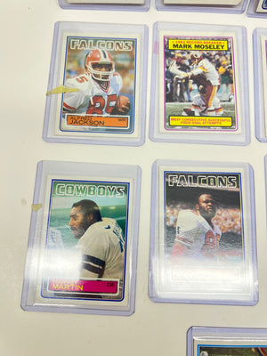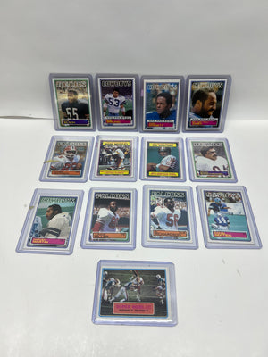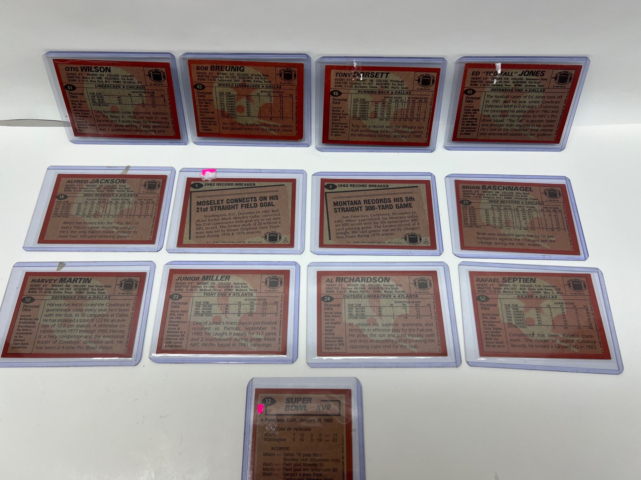 This lot features a collection of 13 football cards showcasing NFL legends, key players, and record-breaking moments. Included are players like Joe Montana, Tony Dorsett, and Otis Wilson, alongside a Super Bowl XVII commemorative card (Redskins vs. Dolphins). The selection spans various teams, including the Bears, Cowboys, and Falcons, offering a snapshot of football history. All cards are preserved in protective sleeves.