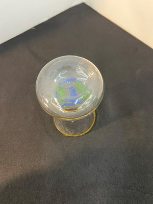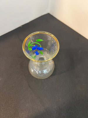Small hand-painted glass vase featuring a vibrant blue floral design with green leaves, accented by a gold rim and detailing. Compact size as seen in scale comparison to a water bottle. Ideal for decorative use or small arrangements. Condition appears excellent with no visible chips or cracks.