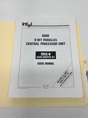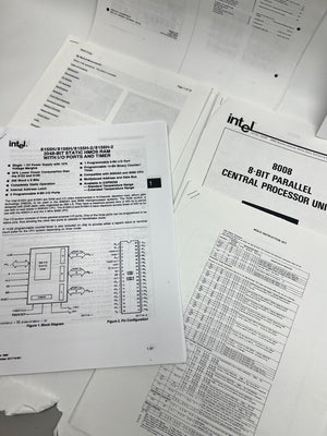 Description: A curated set of technical reprints and documentation for the Intel 8008 8-bit parallel CPU. The lot includes user manuals, detailed circuit schematics, and instructional literature. Notable references to Heathkit integration and early industrial diagrams are included. These documents provide the necessary logic and timing diagrams to understand the 48-instruction set and the 16K memory addressing capabilities of this pioneering chip.