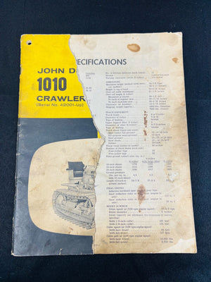 John Deere 1010 Crawler Specifications manual, covering Serial No. 42001 and up. Features specifications, diagrams, and operational details. Shows significant signs of wear, including stains, dirt, and torn pages, but remains a valuable resource for collectors or restorers. Printed with John Deere promotional imagery and service details.