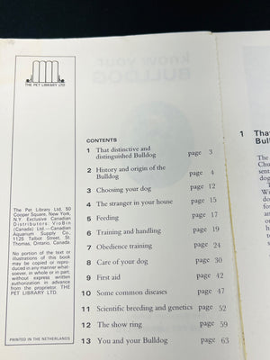 Know Your Bulldog, a booklet published by The Pet Library Ltd in New York, includes detailed contents such as the breed’s history, training and handling, obedience, breeding, and health care. Printed in the Netherlands, it is a part of The Pet Library series, which contains information on diverse pet care topics.