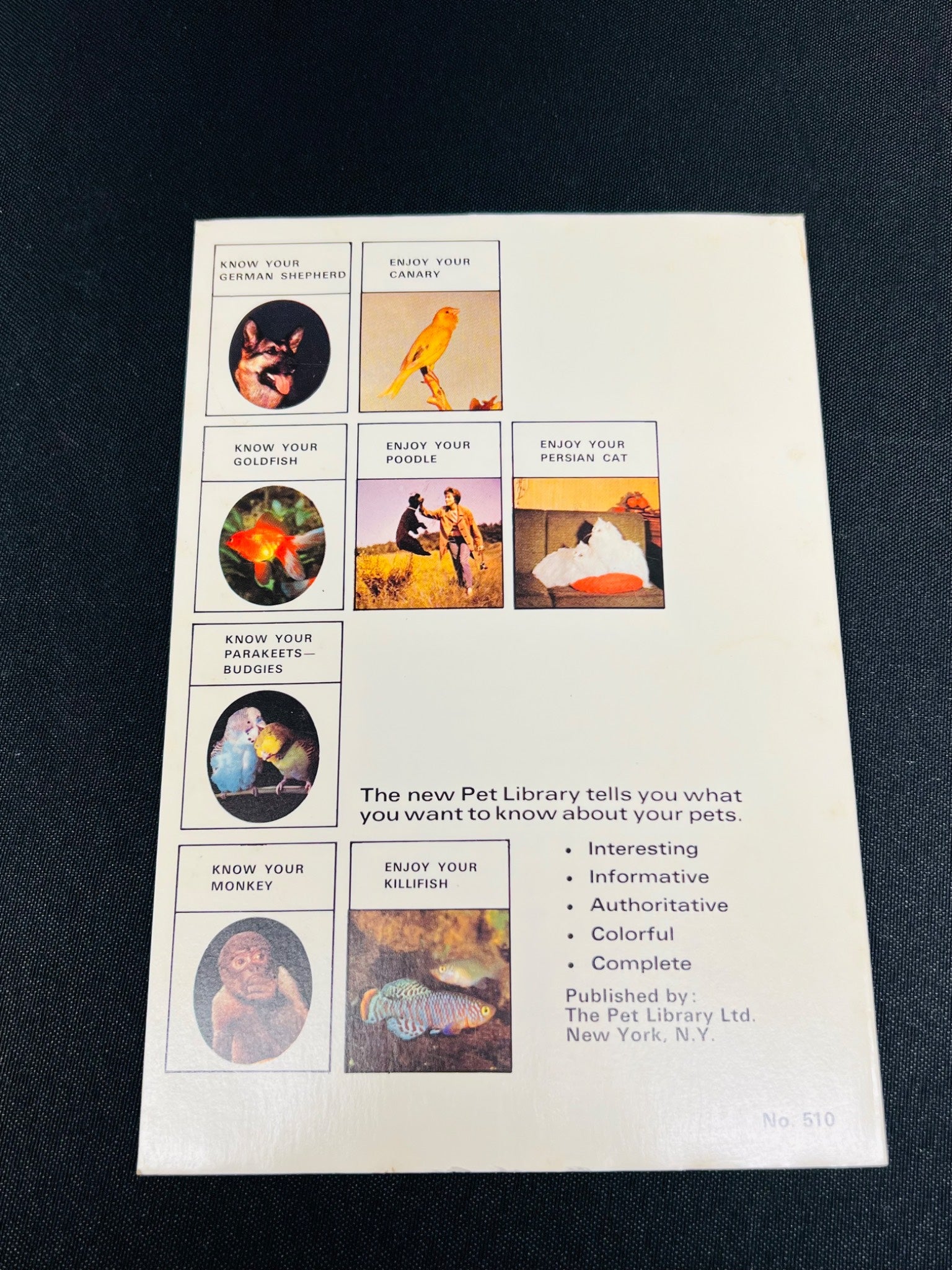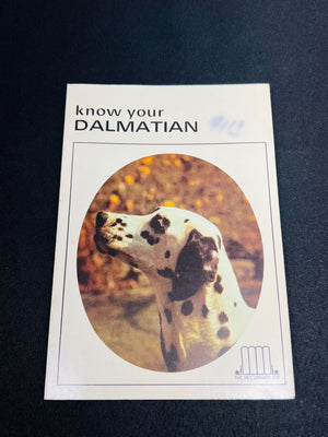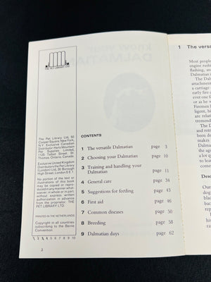 Softcover booklet titled ‘Know Your Dalmatian,’ published by The Pet Library Ltd, New York. Contains 63 pages with topics about the Dalmatian breed, including training, feeding, and common diseases. Published in the Netherlands, this guide is part of a pet care series. Copyright noted to all countries subscribing to the Berne Convention.