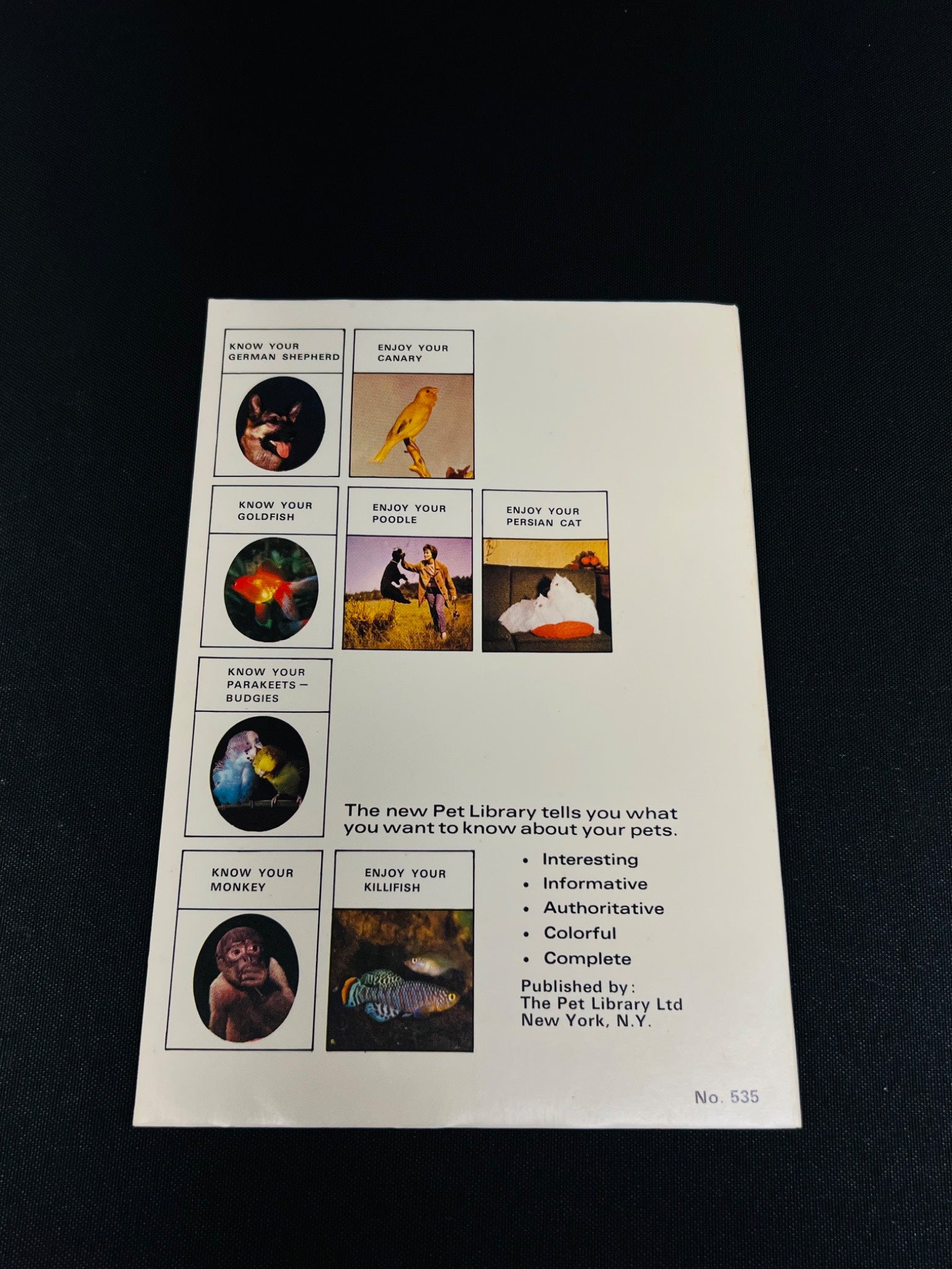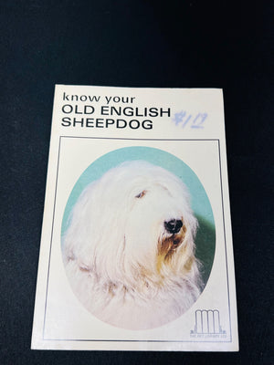 Softcover book titled ‘Know Your Old English Sheepdog,’ published by The Pet Library Ltd, New York, N.Y. Features topics like history, grooming, training, and first aid specific to Old English Sheepdogs. Printed in the Netherlands under copyright. Contains 12 pages with detailed content and illustrations.