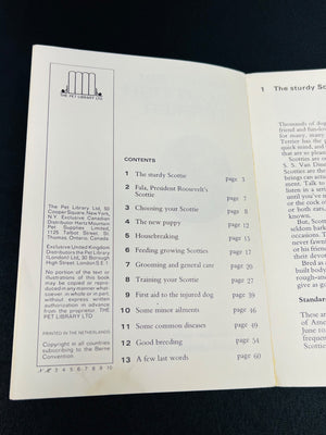 A booklet titled ‘Know Your Scottish Terrier,’ published by The Pet Library Ltd. Covers various topics about Scottish Terriers, as outlined in the table of contents, including care, grooming, breeding, and history. Features color and informative content. Includes 13 pages with detailed information about the breed.