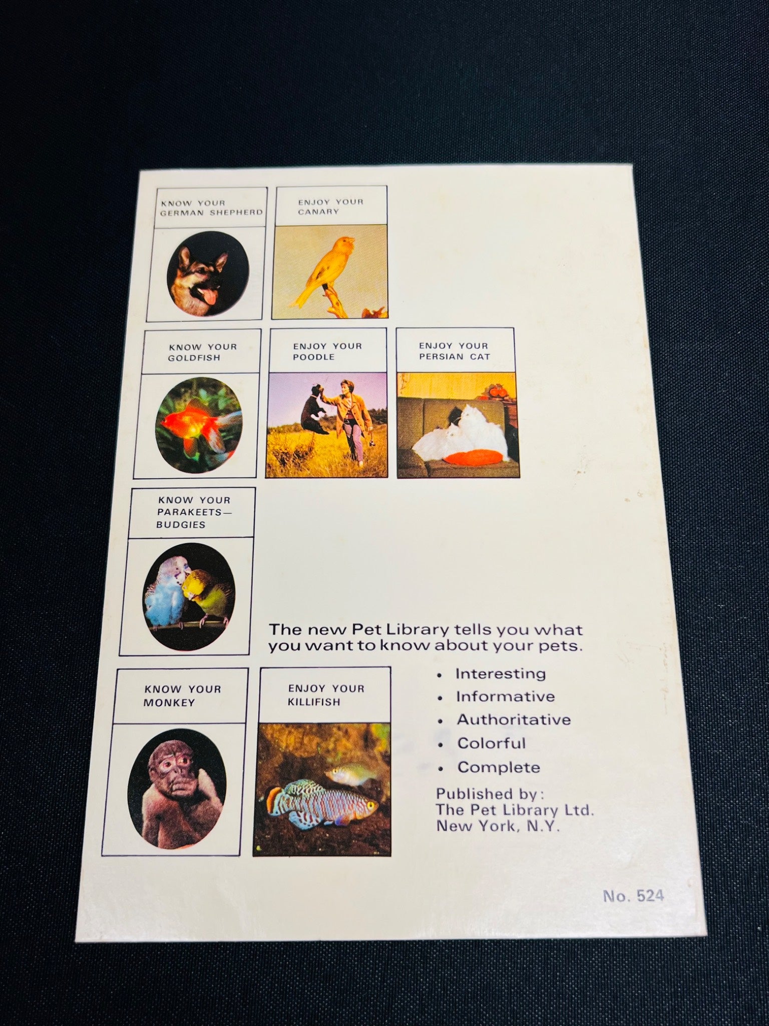 Booklet titled ‘Know Your Shetland Sheepdog’ published by The Pet Library Ltd, New York, NY. Includes 63 pages covering topics such as grooming, training, and caring for Shetland Sheepdogs. Copyright 1967. Features a cover illustration of the dog breed and a table of contents detailing the sections.