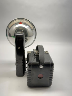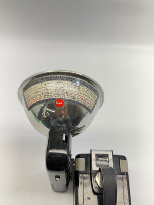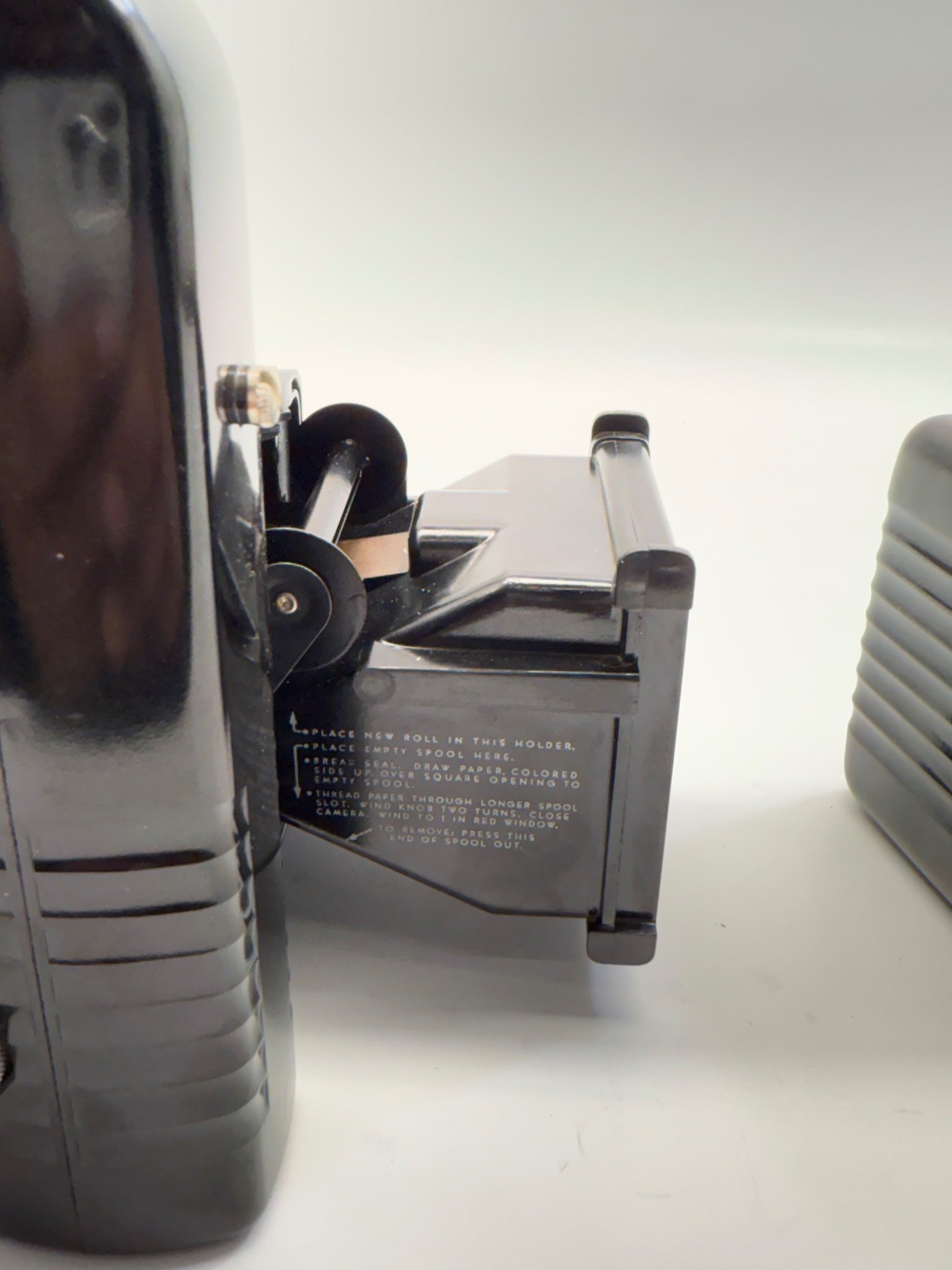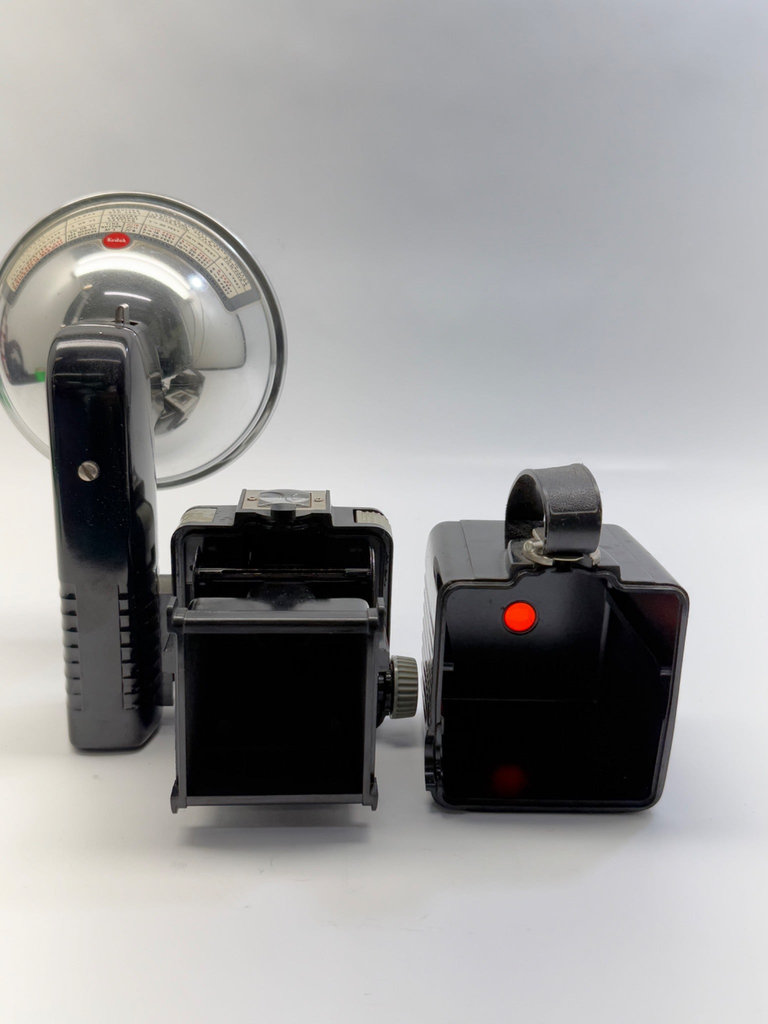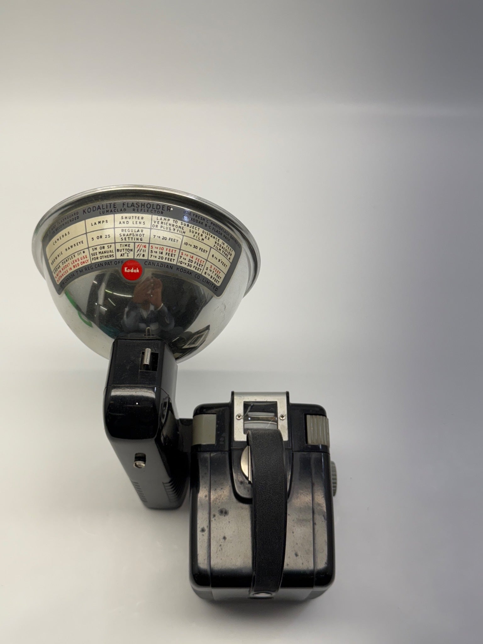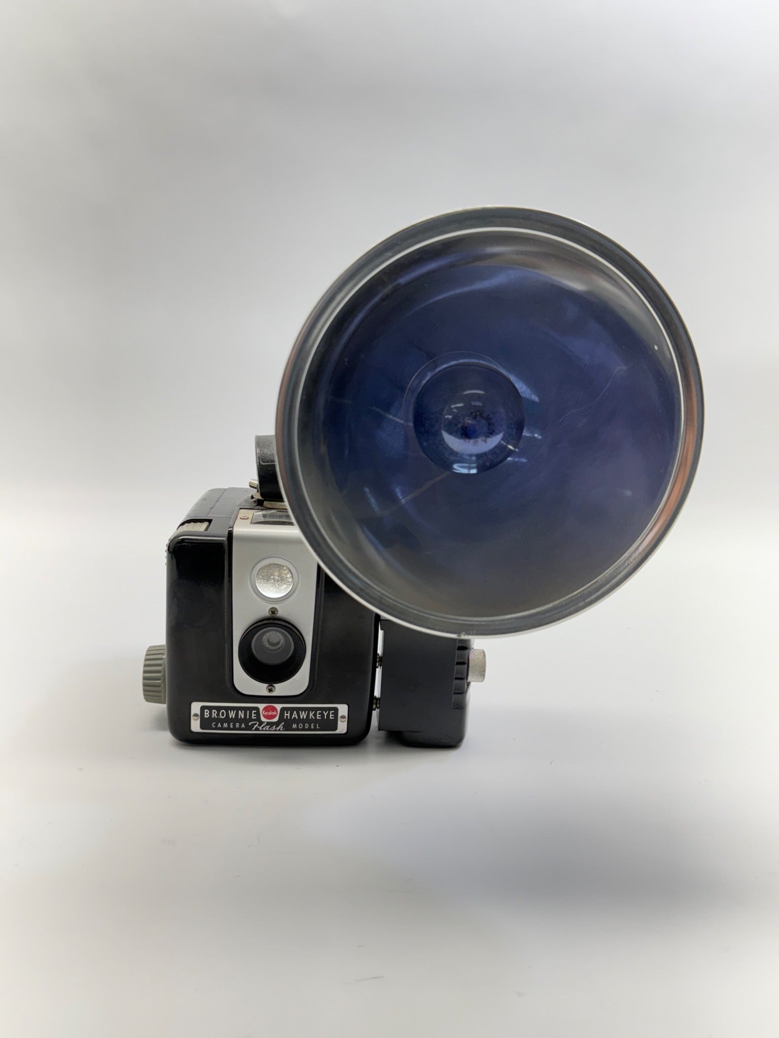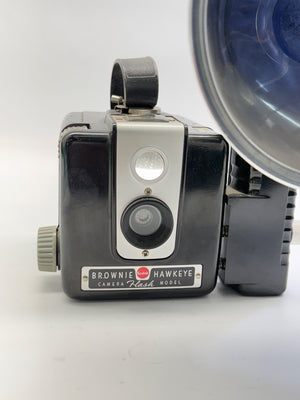 Kodak Brownie Hawkeye Flash Model camera, made of black Bakelite, with chromed flash holder. Features a built-in wrist strap and manual flash settings. Includes red viewing window for film inspection. Shows minor surface wear consistent with use. Dimensions and weight not specified.