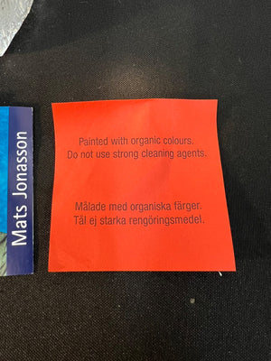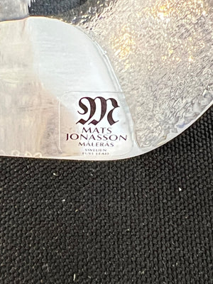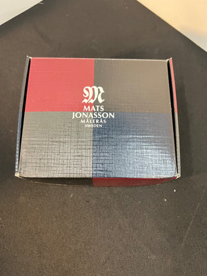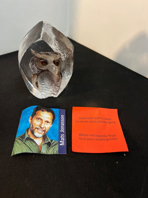 Mats Jonasson Swedish lead crystal sculpture featuring a detailed owl design, painted with organic colors. Includes original box and care instructions. Approx. dimensions not specified. Marked with logo and 'Mats Jonasson Maleras Sweden Full Lead.'