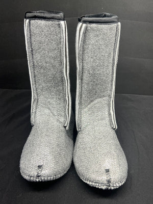 Pair of gray boots with white trim on a black background