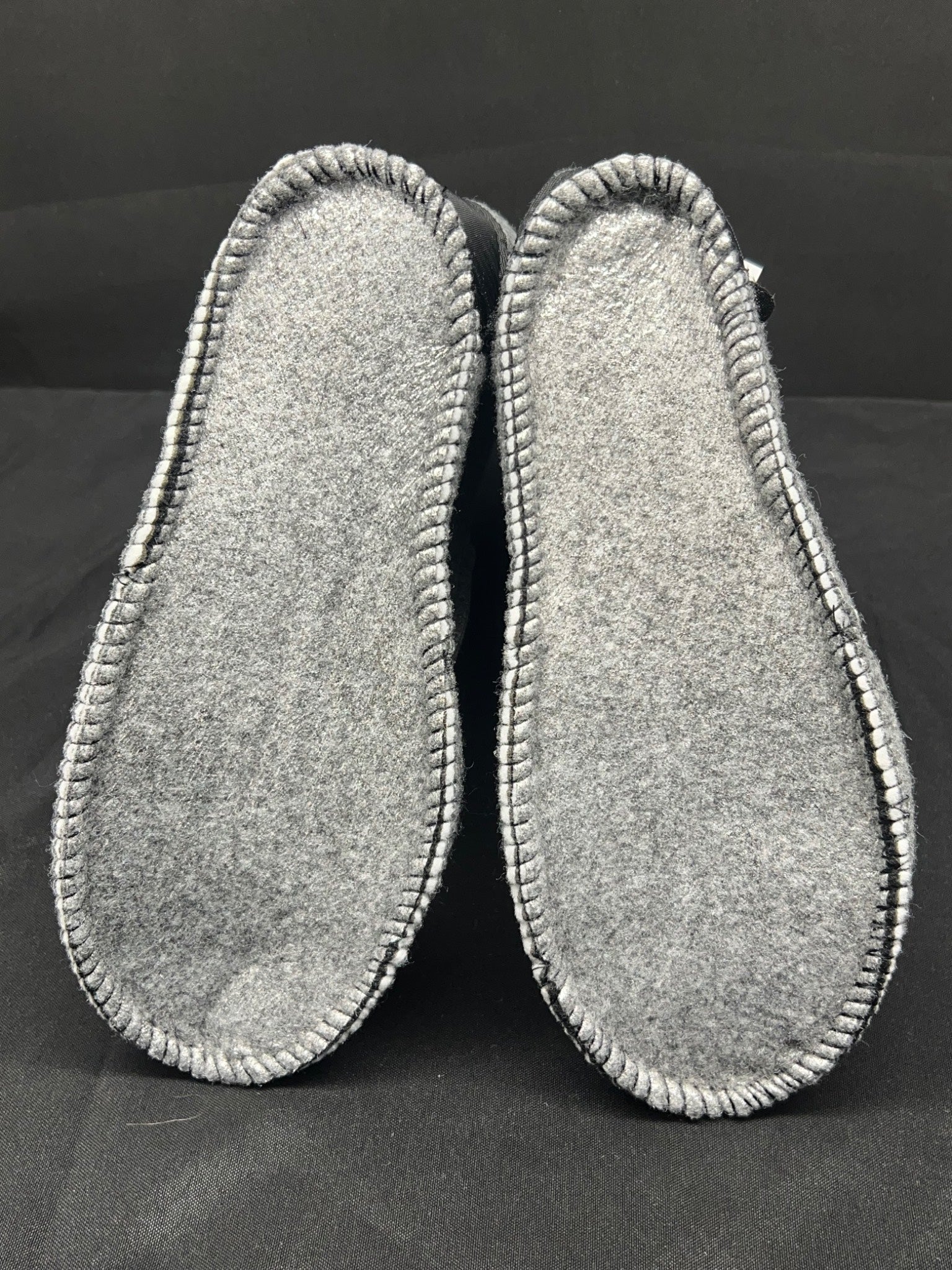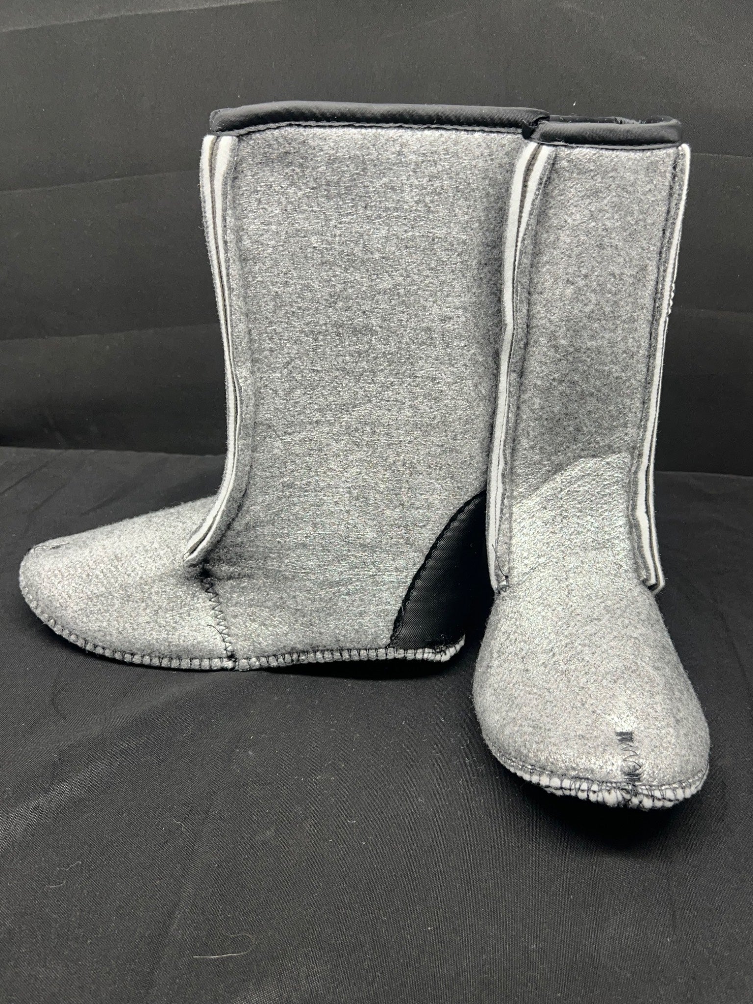 -60 Men’s black High cut boot liners in size 9, constructed from durable and soft felt material. Features reinforced toe and heel areas for added durability. Includes sewn edges for secure wear and a comfortable fit. Item has no visible defects and appears to be in unused condition.