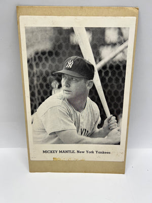 This item features a monochrome portrait of Mickey Mantle, a prominent figure in baseball history, in his New York Yankees uniform. Printed on cardstock, it highlights a period of Mantle's career. The photo does have some condition issues due to its aAge but it still has great Eye appeal. Manufactured in the USA, this piece is a collector's item for sports memorabilia enthusiasts.