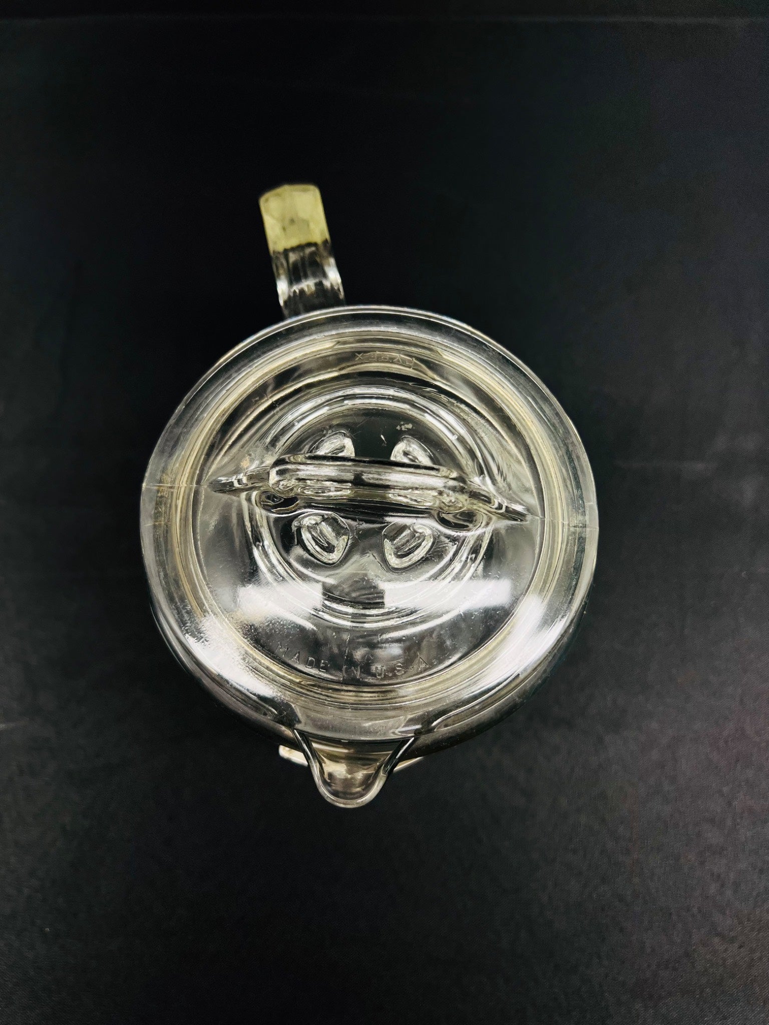 Pyrex glass stovetop coffee percolator, complete with a matching glass lid and a stainless-steel band securing the handle. The lid features ‘Made in USA’ and ‘Pyrex’ markings, while the body and base of the percolator also display the Pyrex branding with the flame logo. Its condition shows signs of use but remains functional.