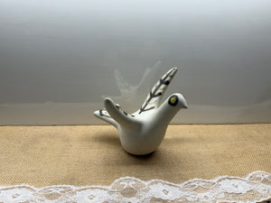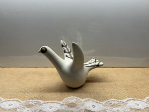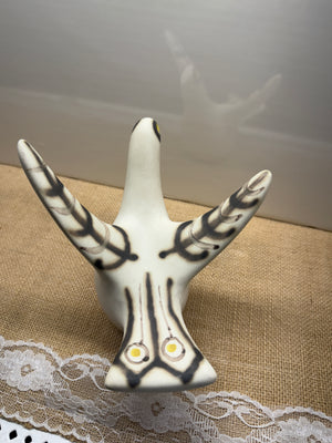 The wings angled seagull Is white in color. The head is angled slightly to the Right. It is six and 8 inches wide by 6 inches high and 7 1/2 inches long. They were produced most likely from 1970s to the 1980s and were out of production by 1992. The seagulls have also been called swans. Strawberry Hill did not make any swans. The seagull is in very good condition and does have felt glued to the base