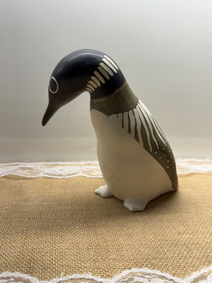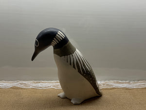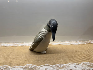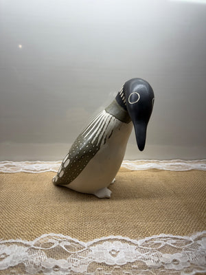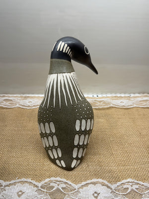 Strawberry Hill pottery sculpture of a loon in a standing position with its head tilted down, often referred to as a dancing loon. Measures 5 1/2 inches wide, 9 inches high, and 6 inches long. The glaze features intricate hand-painted detailing. The piece is marked on the bottom, indicating authenticity.
