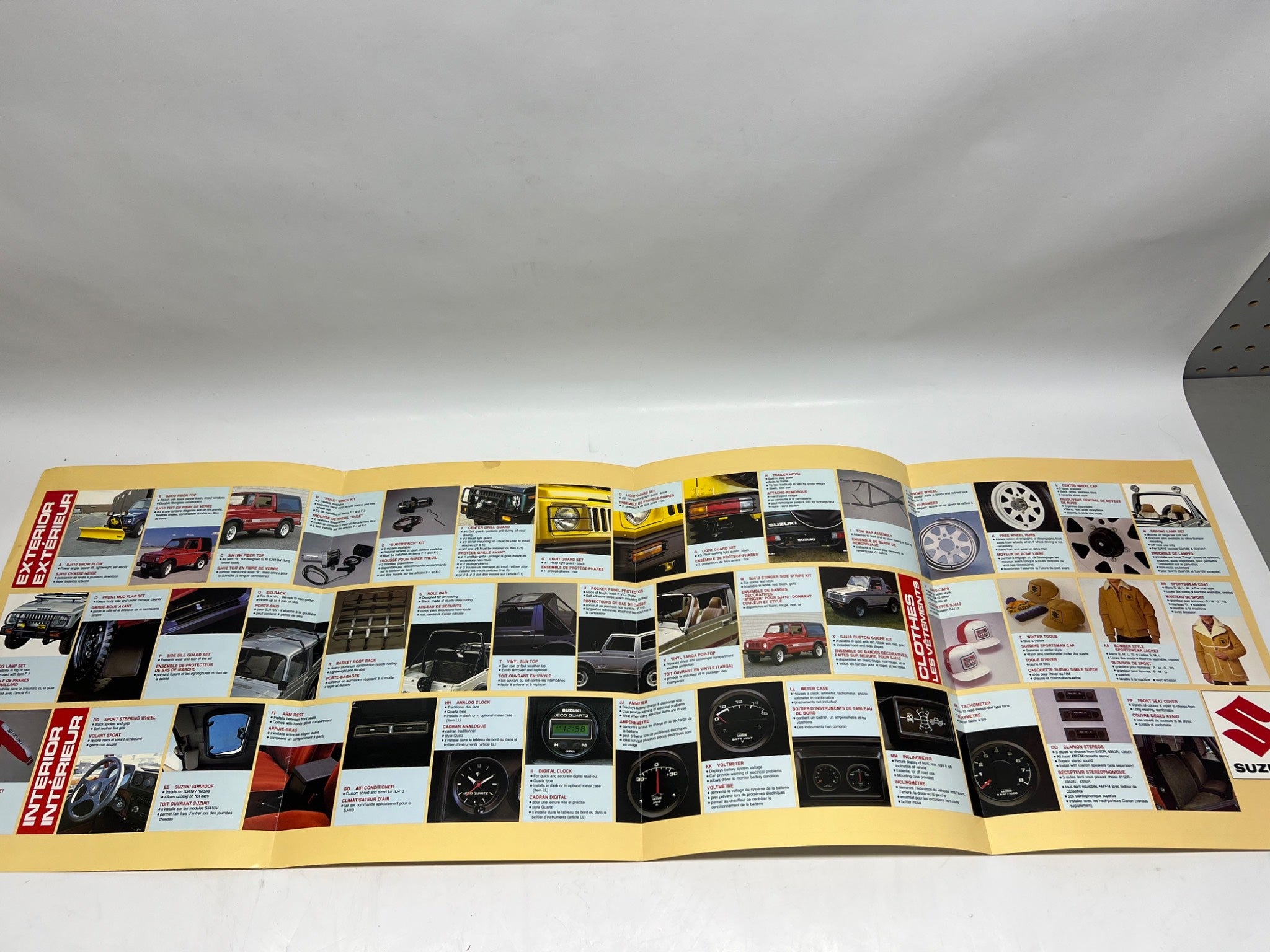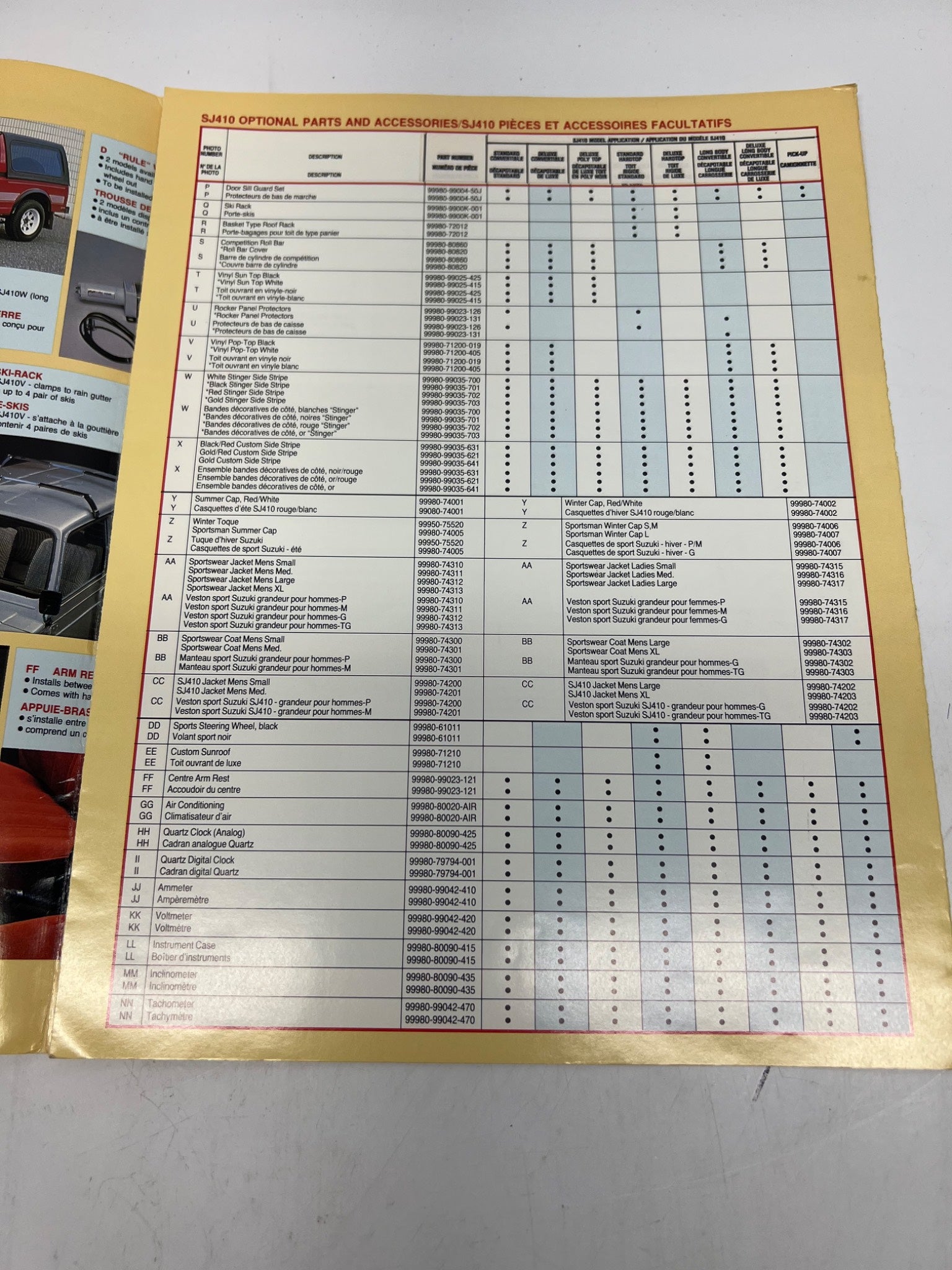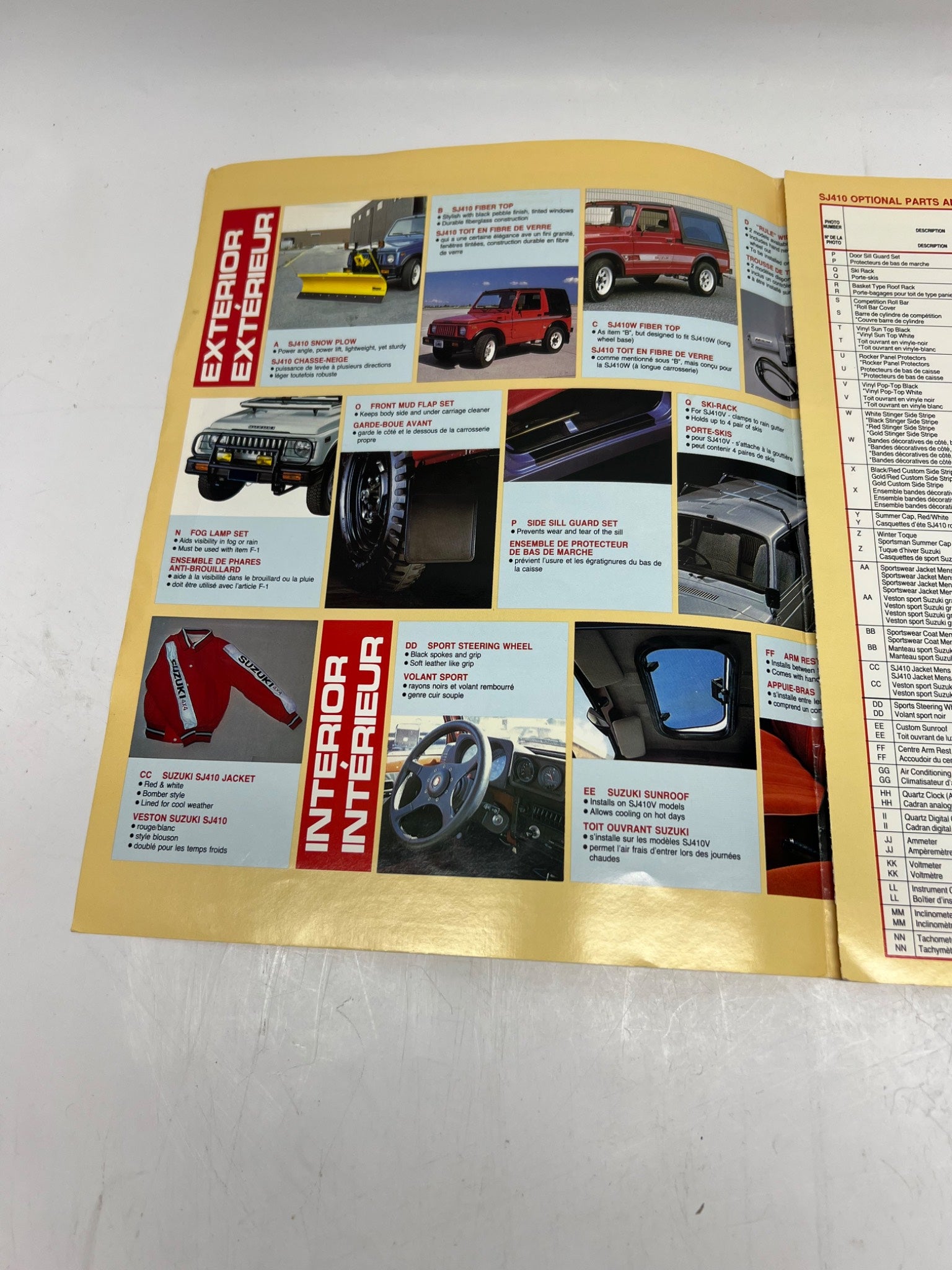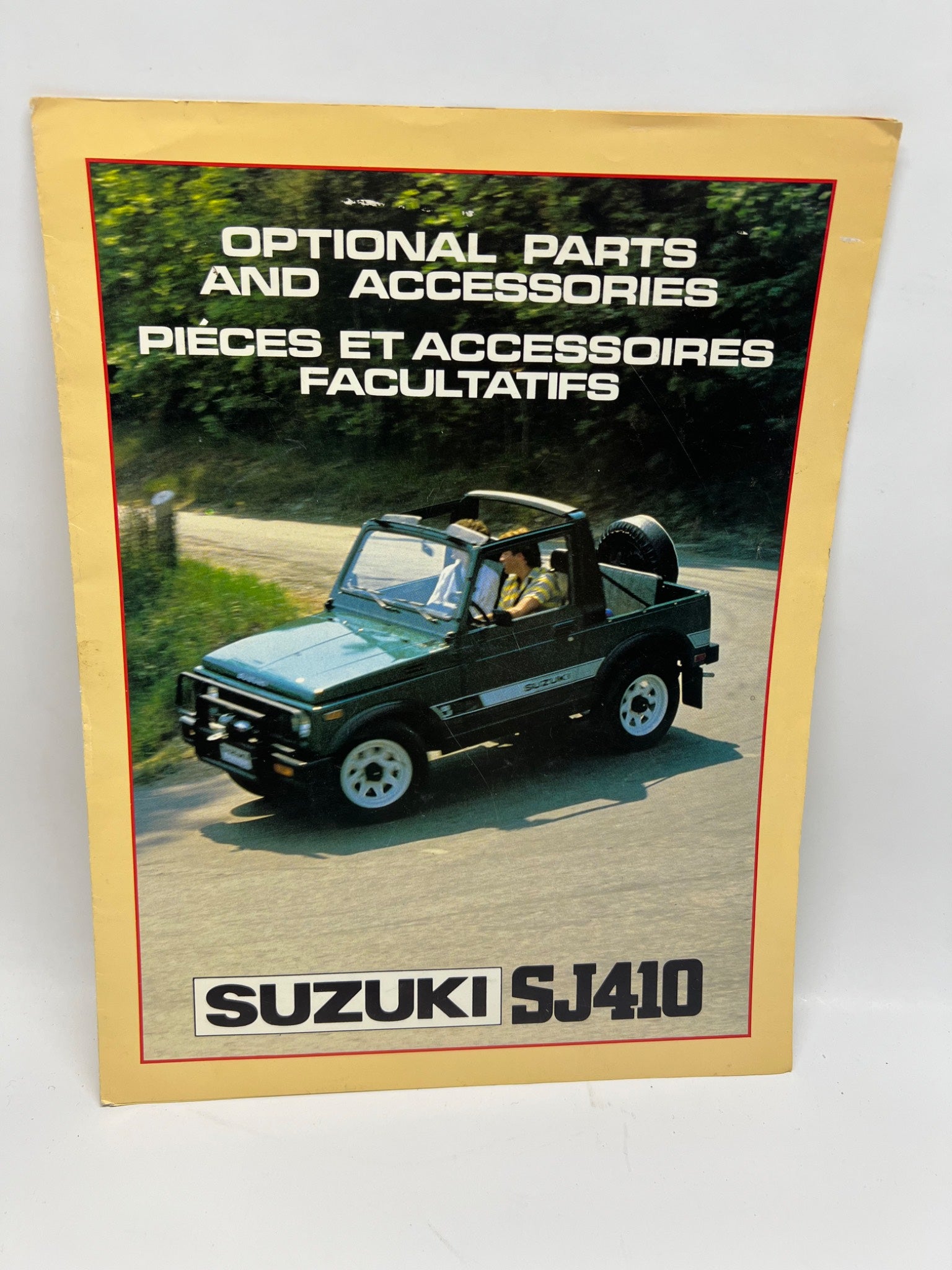This catalog is an official Suzuki SJ410 optional parts and accessories guide, presented in both English and French. Distributed by Suzuki, it provides a comprehensive overview of customizations for this iconic vehicle model. Detailing interior, exterior, and mechanical upgrades, it serves as a historical reference for enthusiasts. Printed in Japan.